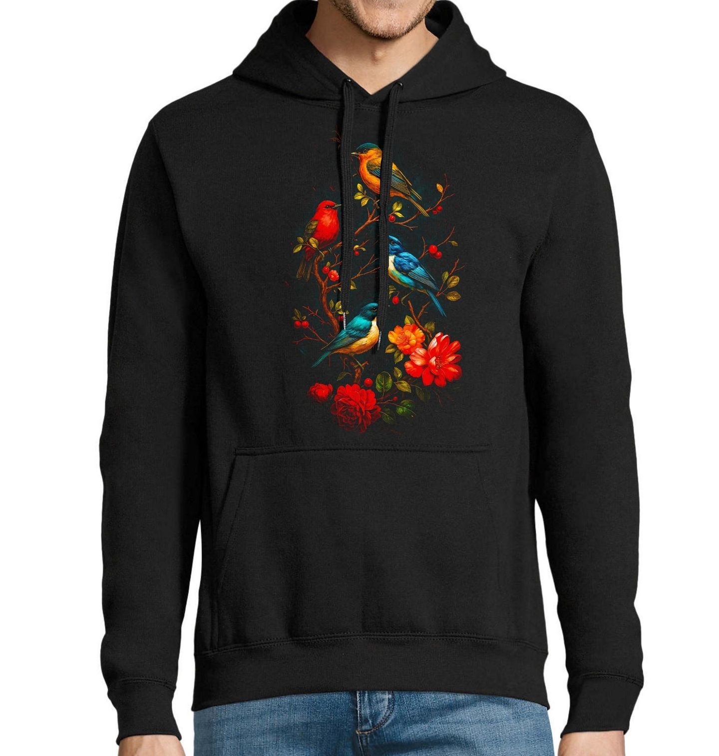 Pánská mikina Barevní Zpěvní Ptáčci. Tento jedinečný motiv zachycuje zpěvné ptáky v podobě umělecké ilustrace inspirované evropskými pěvci, jako je pěnkava, červenka či modráček. Barevná kompozice ptáků usazených na větvích mezi květy symbolizuje harmonii, klid a propojení s přírodou.