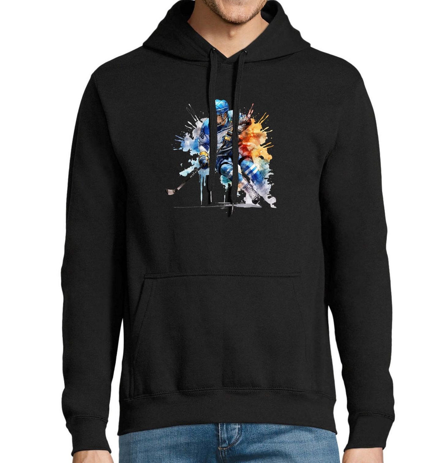 Pánská mikina Barevný Hokejista na Ledu. Tento dynamický motiv zachycuje čistou vášeň a energii, kterou v sobě hokej jako sport nese. Hráč v plné rychlosti proráží barevným akvarelovým pozadím a vytváří tak moderní a výrazný design, který zaujme na první pohled. Ideální pro všechny fanoušky, hráče i trenéry, kteří chtějí ukázat, že hokej je jejich životní styl.