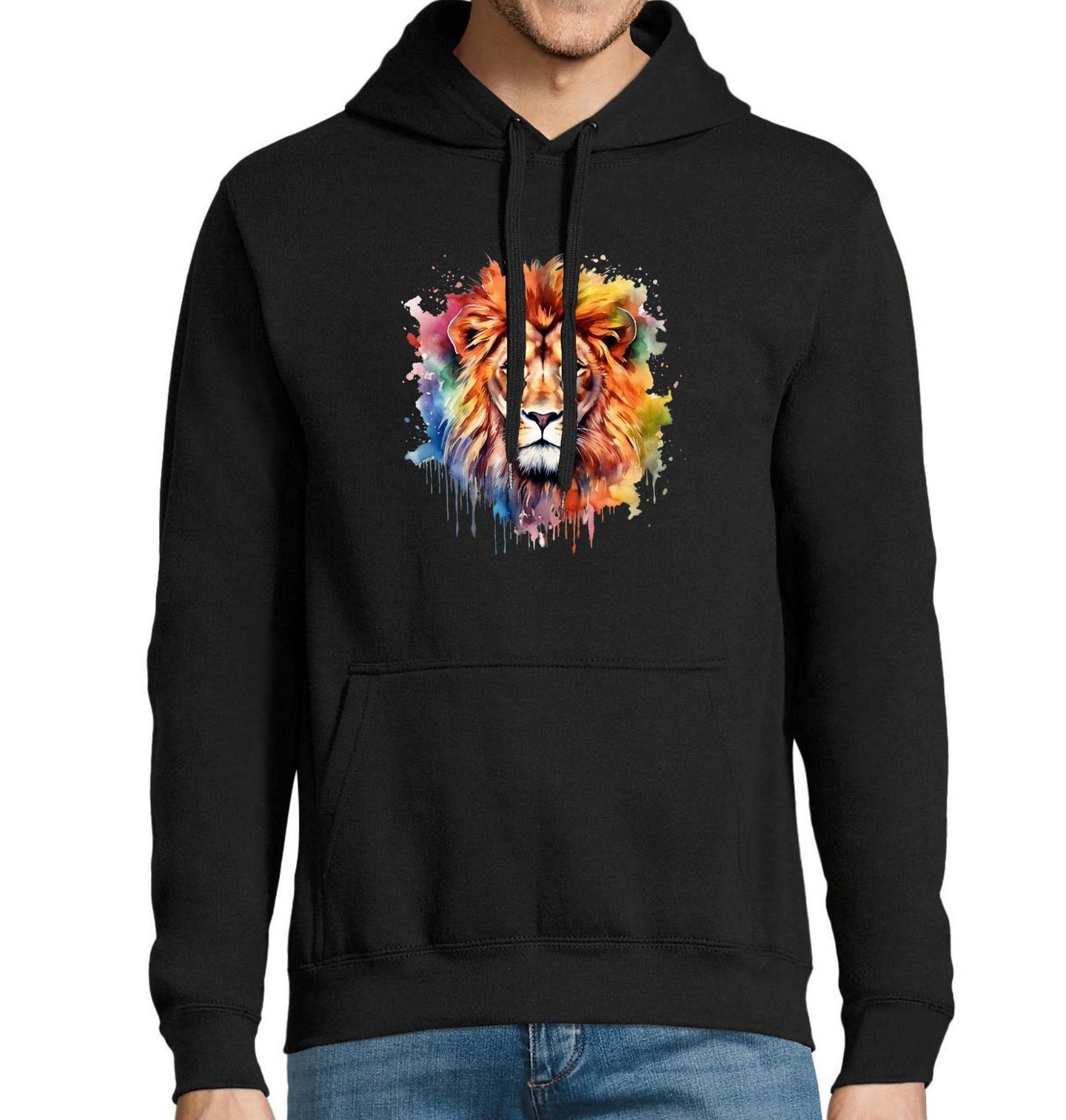 Pánská mikina Barevný Lev. Síla v očích, duše v barvách. Tento lev není obyčejný – jeho barevná hříva je jako výbuch emocí, odvahy a energie. Symbol hrdosti, který nese barvy krále džungle na sobě jako korunu.