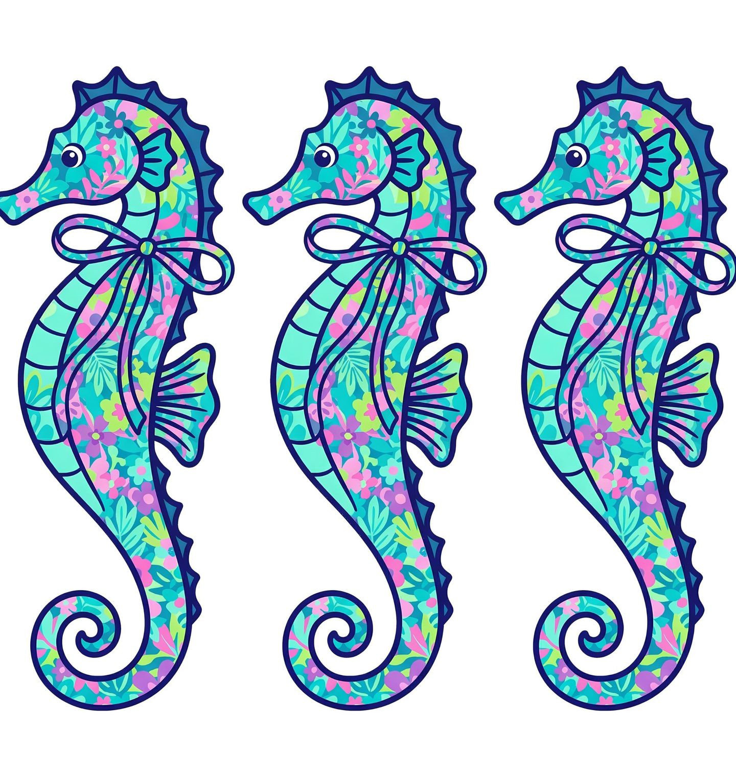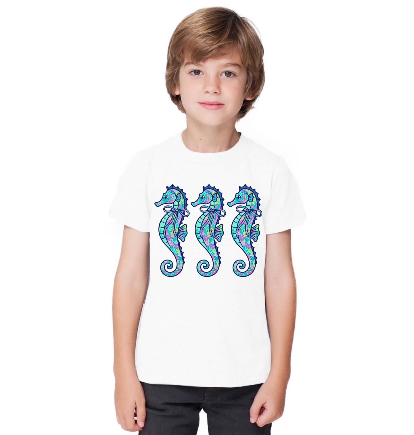 Dětské tričko Barevný Mořský Koník. Opakující se motiv mořského koníka (seahorse) s květinovým vzorem vytváří moderní a stylový design. Kombinace modrých a zelených tónů s jemnými detaily působí svěže a hravě. Tento motiv je ideální pro milovníky mořských živočichů, oceánu a letního stylu.
