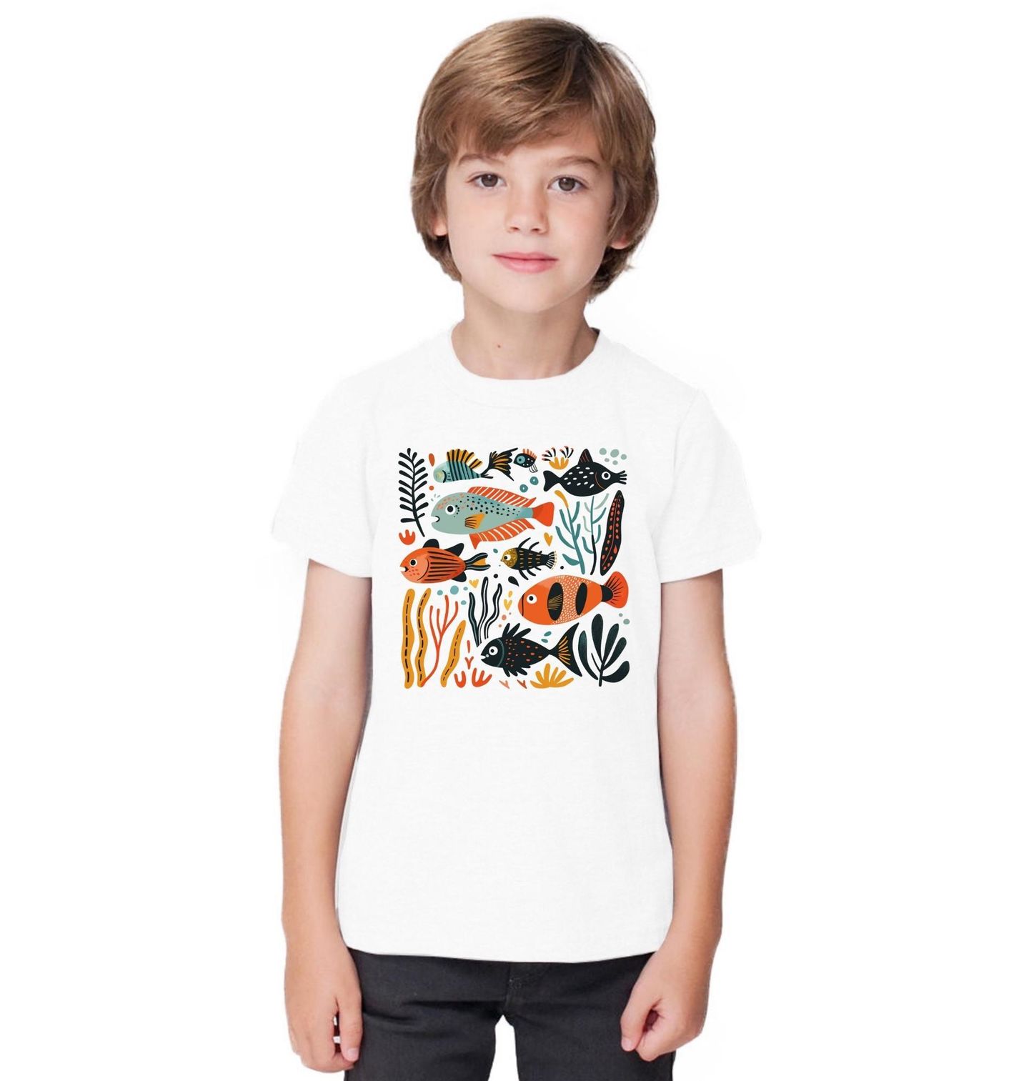 Dětské tričko Barevný Podmořský Svět Ryb. Veselý a moderní motiv plný života zachycuje ryba i různorodé ryby v pestrém prostředí moře. Kombinace výrazných barev, jednoduchých tvarů a hravých detailů vytváří dynamickou ilustraci, která okamžitě zaujme. Skvěle se hodí pro milovníky oceánu, hravého designu a svěžích barev, které rozzáří každý outfit.