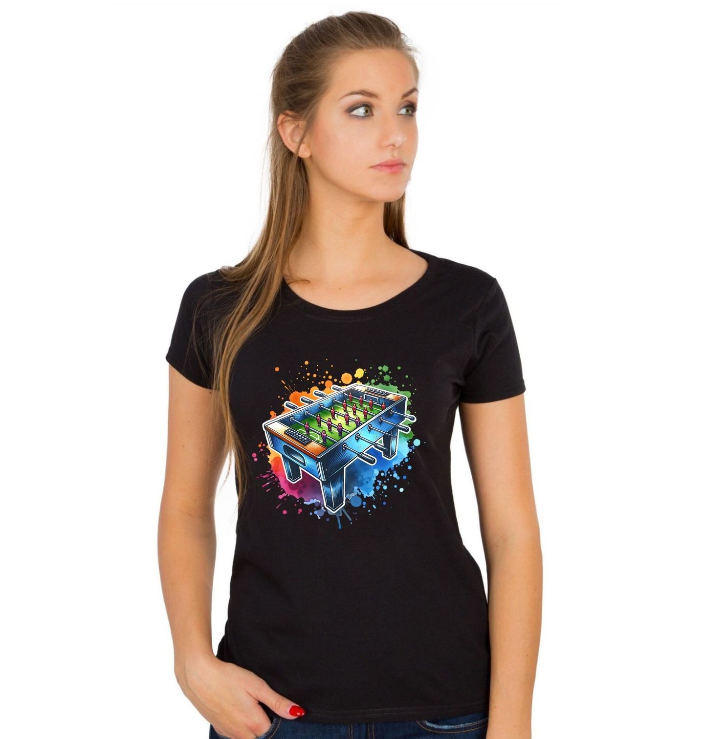 Dámské tričko Barevný Stolní Fotbálek. Veselý a dynamický motiv s realisticky zpracovaným herním stolem potěší každého, kdo miluje stolní fotbálek. Barevné inkoustové efekty v pozadí dodávají designu energii, pohyb a hravou atmosféru – přesně jako má správný zápas. Ať už hrajete pro zábavu s přáteli, nebo berete fotbal vážně, tenhle motiv to řekne za vás.