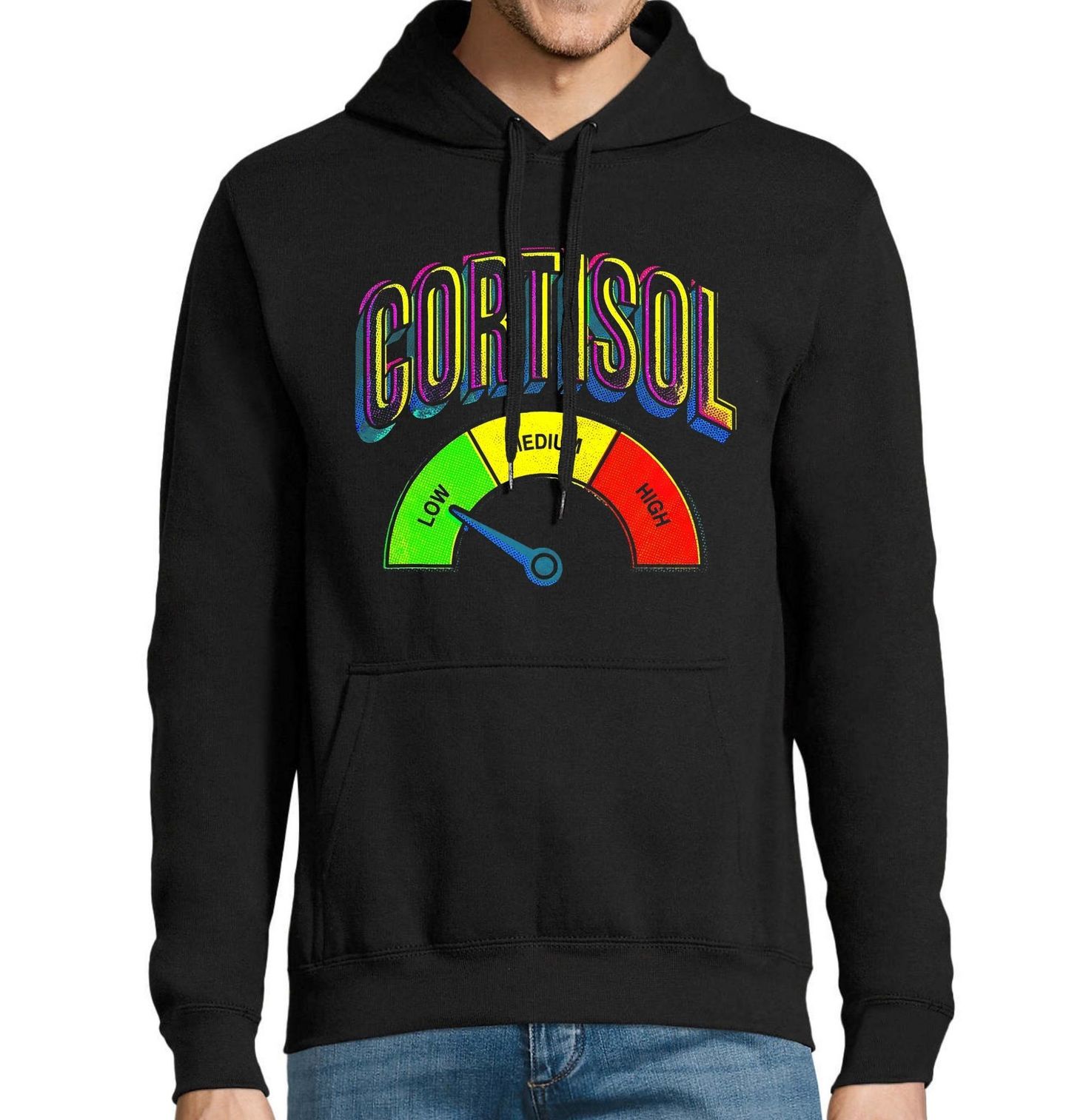 Pánská mikina Barevný Ukazatel Stresu Cortisol. Výrazný grafický motiv znázorňuje, jak kortizol přechází od nízké přes střední až po vysokou úroveň. Barevná škála jasně ukazuje, že kortizol hraje zásadní roli při zvládání stresu a udržení vnitřní rovnováhy.