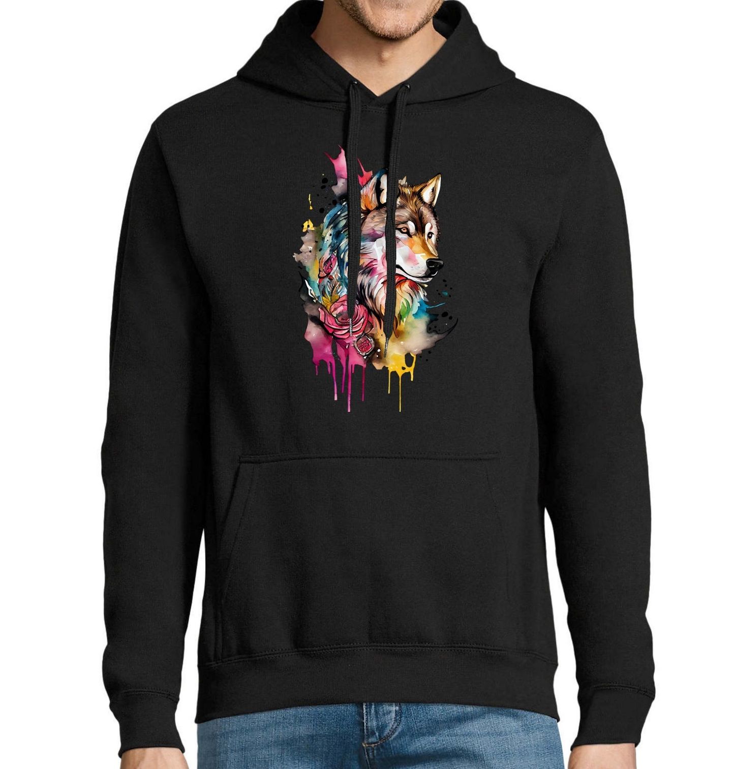 Pánská mikina Barevný Vlk Colorful Wolf. Tento originální design zachycuje hlavu vlka v pestrých barvách, obklopenou květy, které dodávají celému motivu hravou eleganci. Spojení divoké energie a jemných přírodních prvků vytváří jedinečný kousek pro milovníky netradičních a výrazných vzorů.