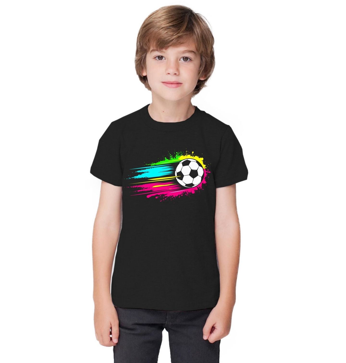 Dětské tričko Barevný Výkop Fotbalového Míče. Tento originální potisk s motivem míče letícího v duhovém výbuchu barev je ideální volbou pro každého, kdo miluje sport, míč a především fotbal! Díky modernímu stylu s neonovými odstíny a dynamickým efektem rychlosti zaujme na první pohled