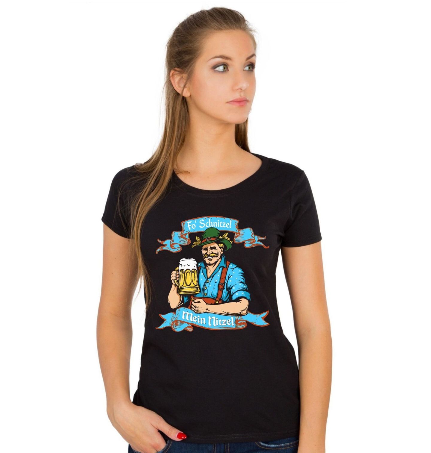 Dámské tričko Bavorský Pivař. Veselý motiv zobrazuje tradičního bavorského muže v klobouku, který drží půllitr piva. Text „Fö Schnitzel Mein Nitzel“ je humorná slovní hříčka inspirovaná německou výslovností a naráží na oblíbené jídlo schnitzel, tedy řízek. Design připomíná typickou atmosféru Oktoberfestu, kde nechybí pivo, dobré jídlo a veselá bavorská nálada.
