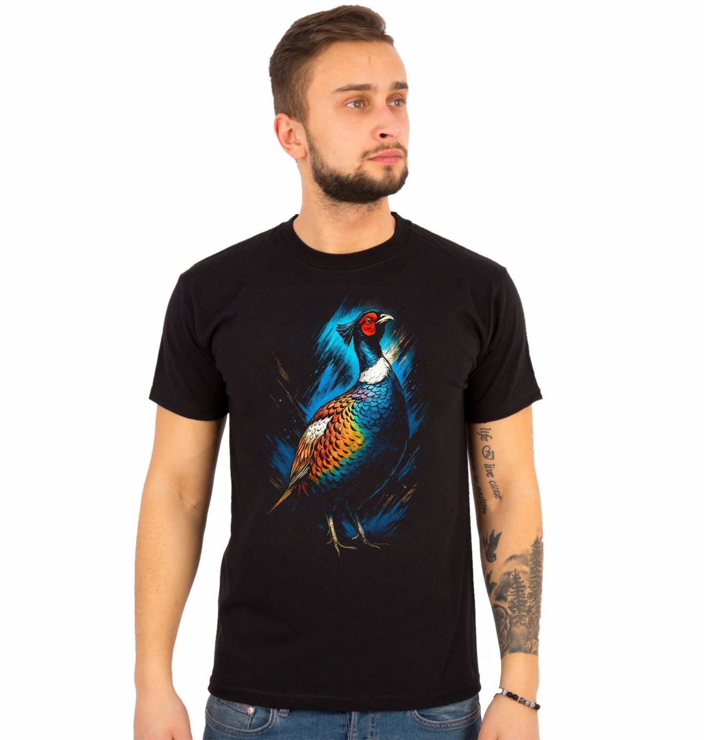 Pánské tričko Bažant obecný. Bažant obecný je známý svým bohatě zbarveným peřím, kovovými odlesky a hrdým postojem, který symbolizuje sílu, eleganci a divokou přírodu. Umělecké zpracování zdůrazňuje kontrast sytých barev a dynamický tvar těla, díky čemuž motiv působí moderně a energicky.