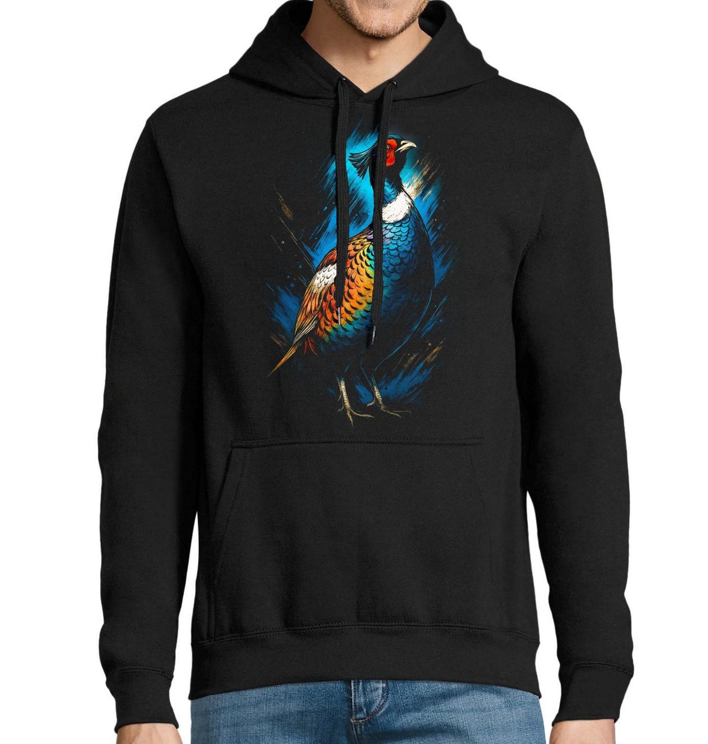 Pánská mikina Bažant obecný. Bažant obecný je známý svým bohatě zbarveným peřím, kovovými odlesky a hrdým postojem, který symbolizuje sílu, eleganci a divokou přírodu. Umělecké zpracování zdůrazňuje kontrast sytých barev a dynamický tvar těla, díky čemuž motiv působí moderně a energicky.
