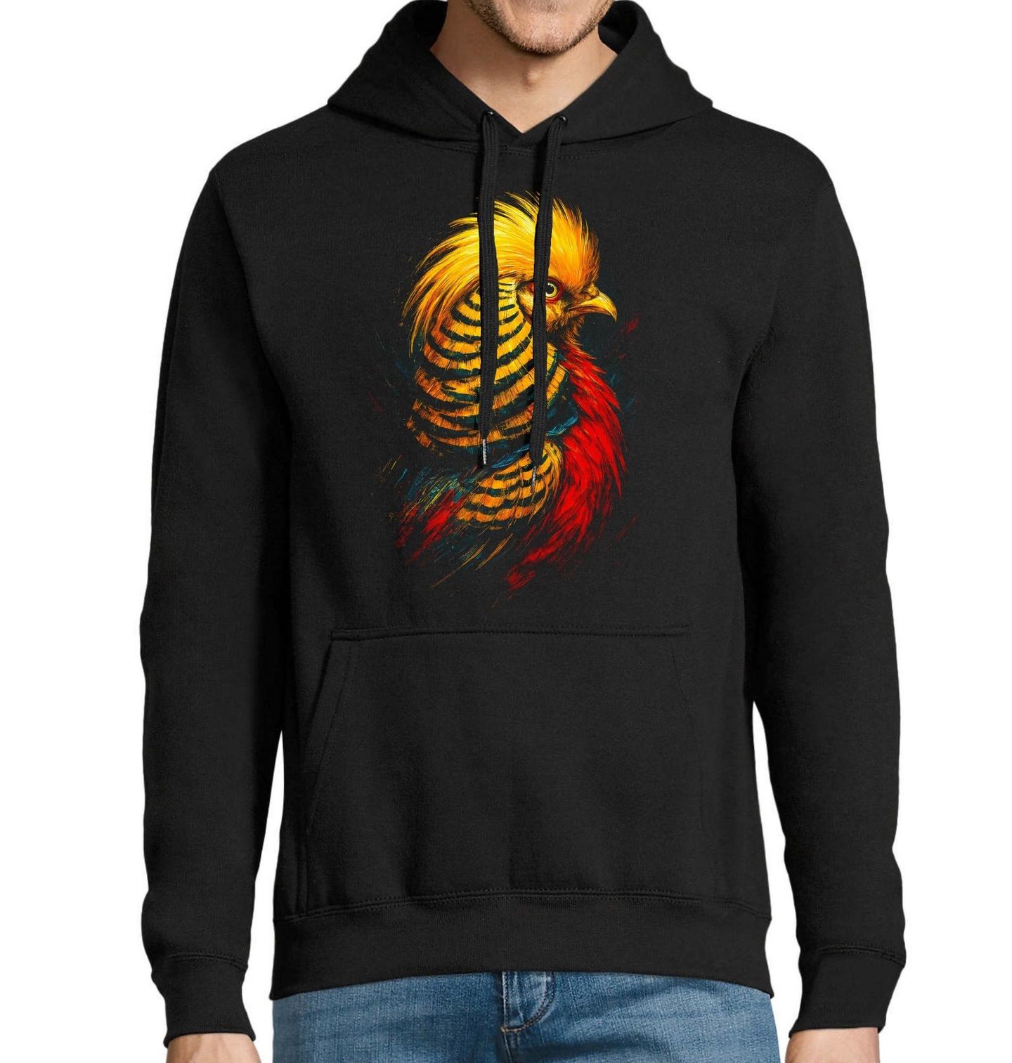 Pánská mikina Bažant zlatý. Tento výrazný motiv zachycuje exotický pták jménem bažant zlatý (Chrysolophus pictus), jeden z nejkrásnějších druhů bažantů na světě. Pták je proslulý svou zářivou zlatou chocholkou, pruhovaným límcem a kontrastním červeným tělem, které vyniká svou elegancí i jedinečným zbarvením.