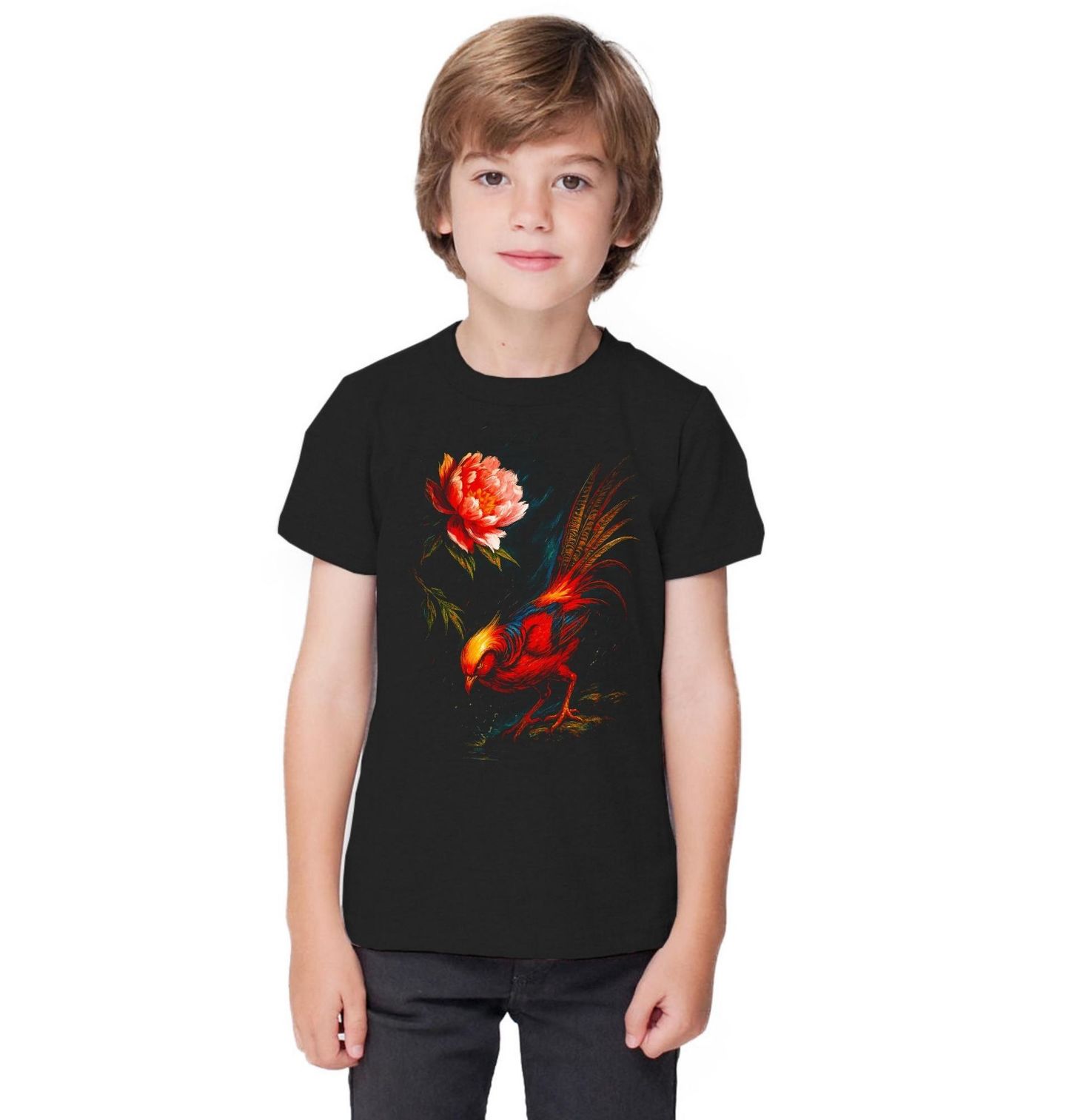 Dětské tričko Bažant zlatý s Květinou. Bažant zlatý je pták z řádu hrabavých obývající lesy a hornaté oblasti na území západní Číny, jako lovný druh byl však vysazen i v řadě jiných světových zemí. Bažant je známý svým pestrým peřím, dlouhým ocasem a výraznými barvami, které symbolizují krásu, eleganci a sílu přírody.