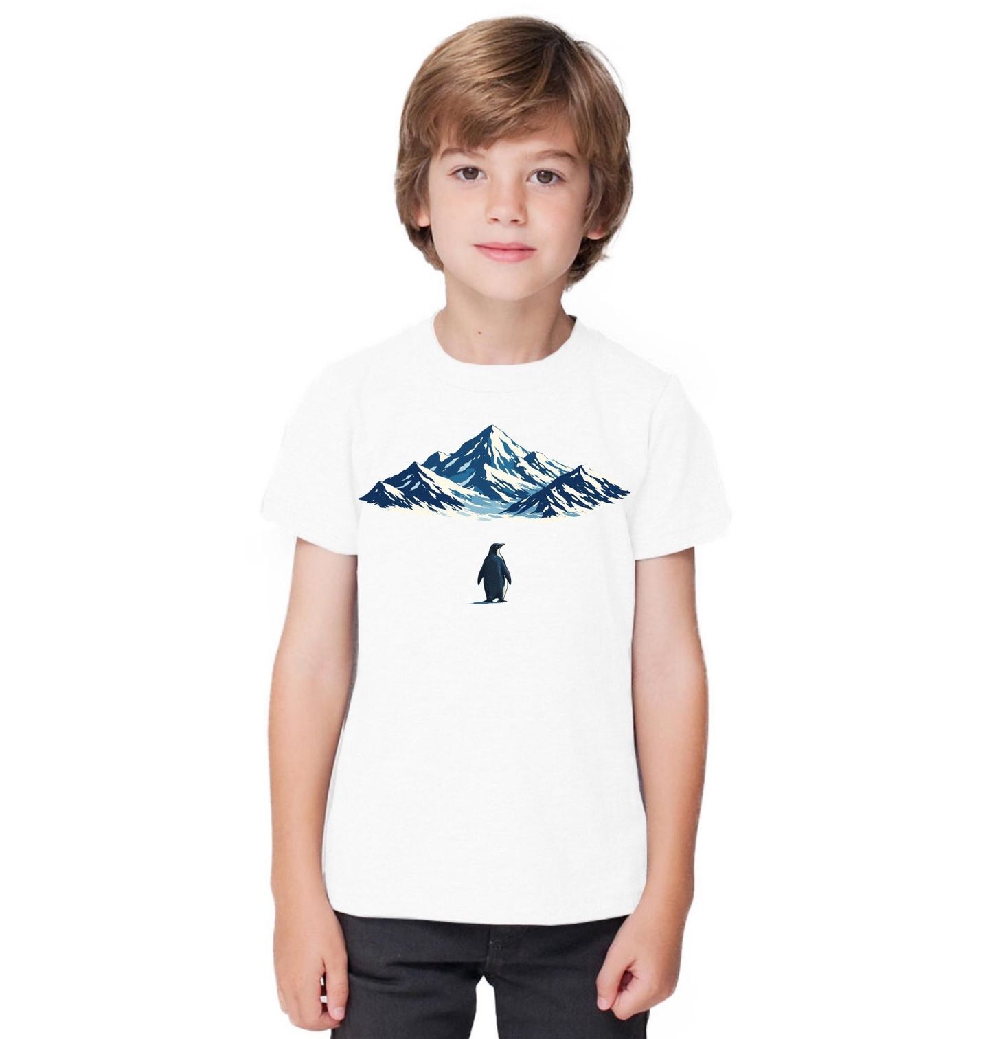 Dětské tričko Be the Damn Penguin But Why. Minimalistický motiv zachycuje osamělého tučňáka stojícího pod majestátními horami v čistém, estetickém stylu. Tento design vychází z aktuálního internetového trendu „but why“, který se stal viral meme fenoménem na sociálních sítích. Tučňák zde symbolizuje tichou otázku, lehkou existenciální náladu i jemný humor, který je pro meme kulturu typický.