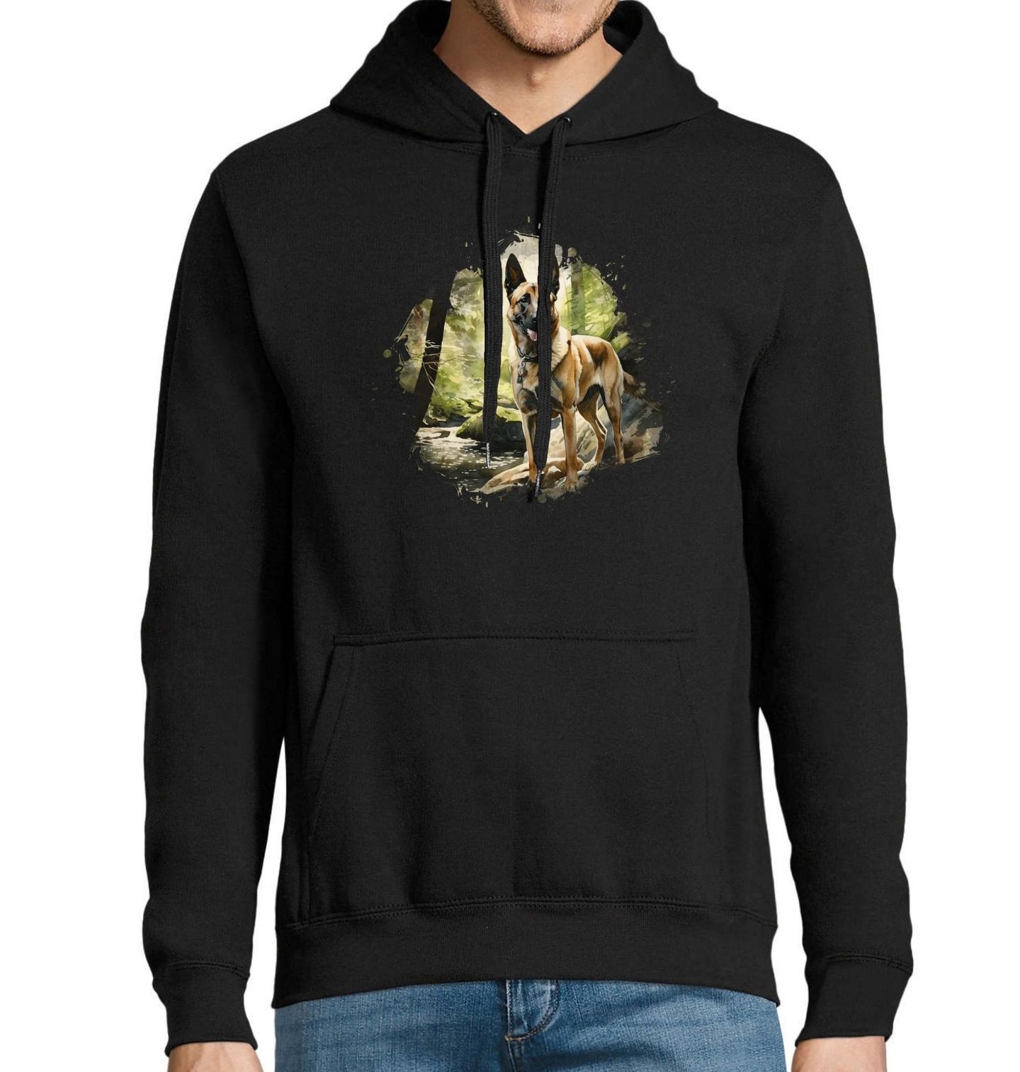 Pánská mikina Belgický ovčák u Potoka. Belgický ovčák – Malinois v jeho přirozeném živlu – ve volné přírodě. Věrný a sebejistý pes, který je vždy připraven chránit svého pána i objevovat nová dobrodružství. Ideální volba pro každého pejskaře, který miluje akční plemena a outdoorový styl života.