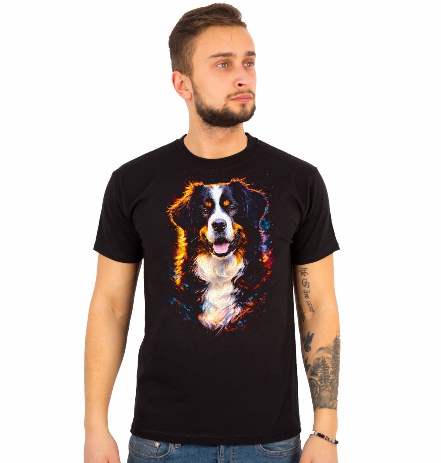 Pánské tričko Bernský salašnický pes Bernese Mountain Dog. Tento krásný pes s typickým trikolorním zbarvením (černá, bílá a hnědá) vyniká nejen svým vzhledem, ale i přátelským a oddaným charakterem. Každý pejskař ocení detailní zpracování srsti, výrazné oči a radostný výraz, který vystihuje milující povahu tohoto plemene. Bernský salašnický pes je ideální rodinný pes, známý svou trpělivostí, inteligencí a ochranitelským instinktem.