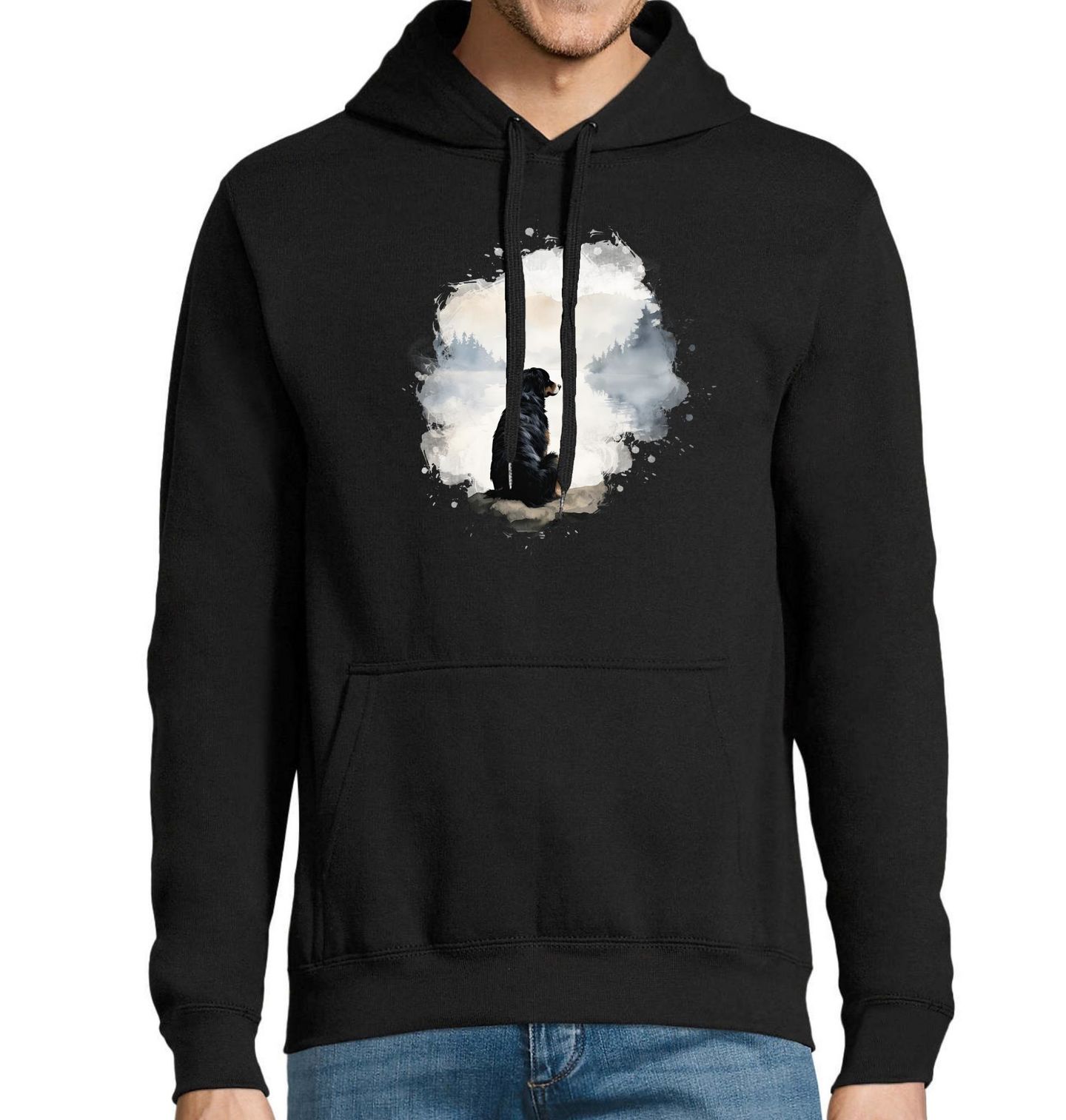 Pánská mikina Bernský salašnický pes u Jezera. Tento nádherný design zachycuje Bernského salašnického psa při klidném posezení u jezera – dokonale vystihuje hluboké pouto, které pejskař sdílí se svým věrným čtyřnohým přítelem. Motiv osloví každého, komu pes není jen mazlíček, ale parťák do života.