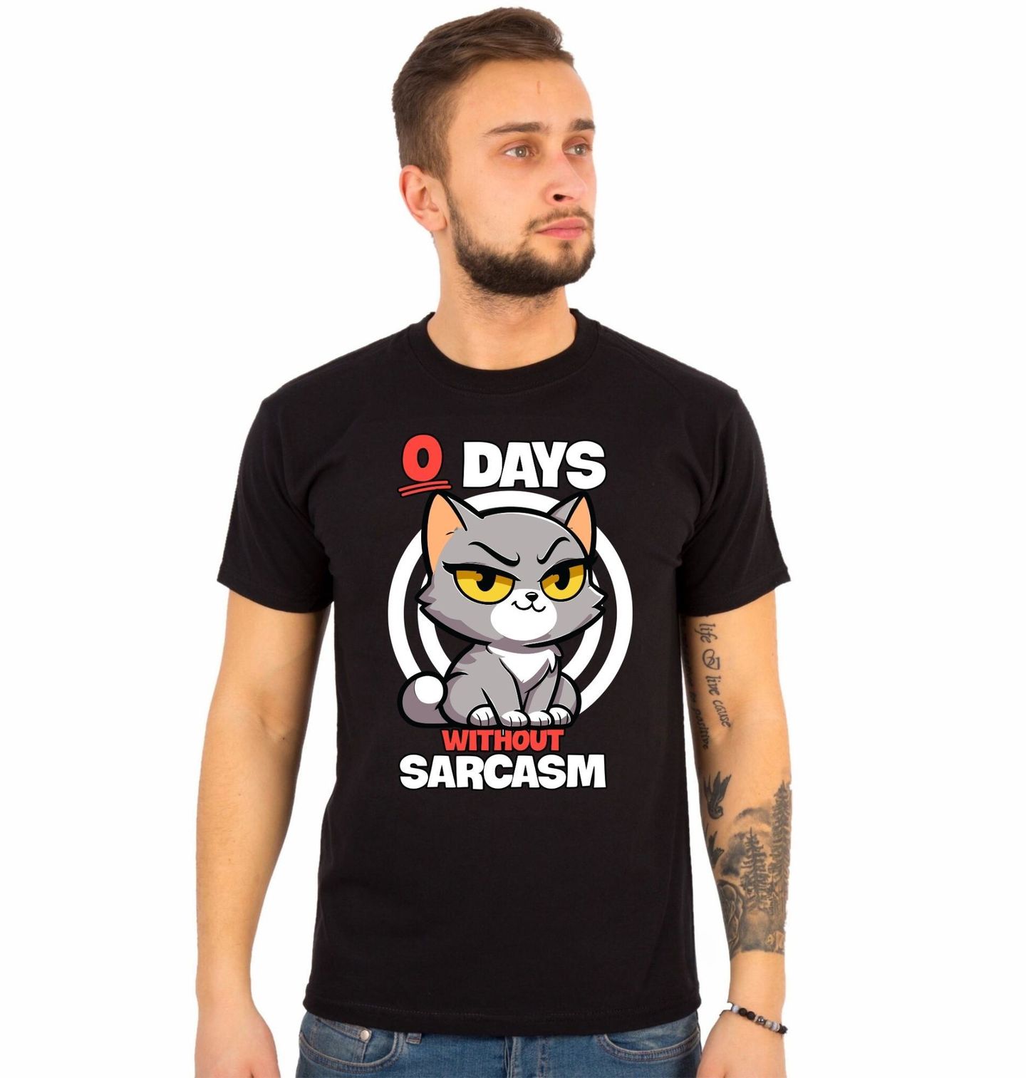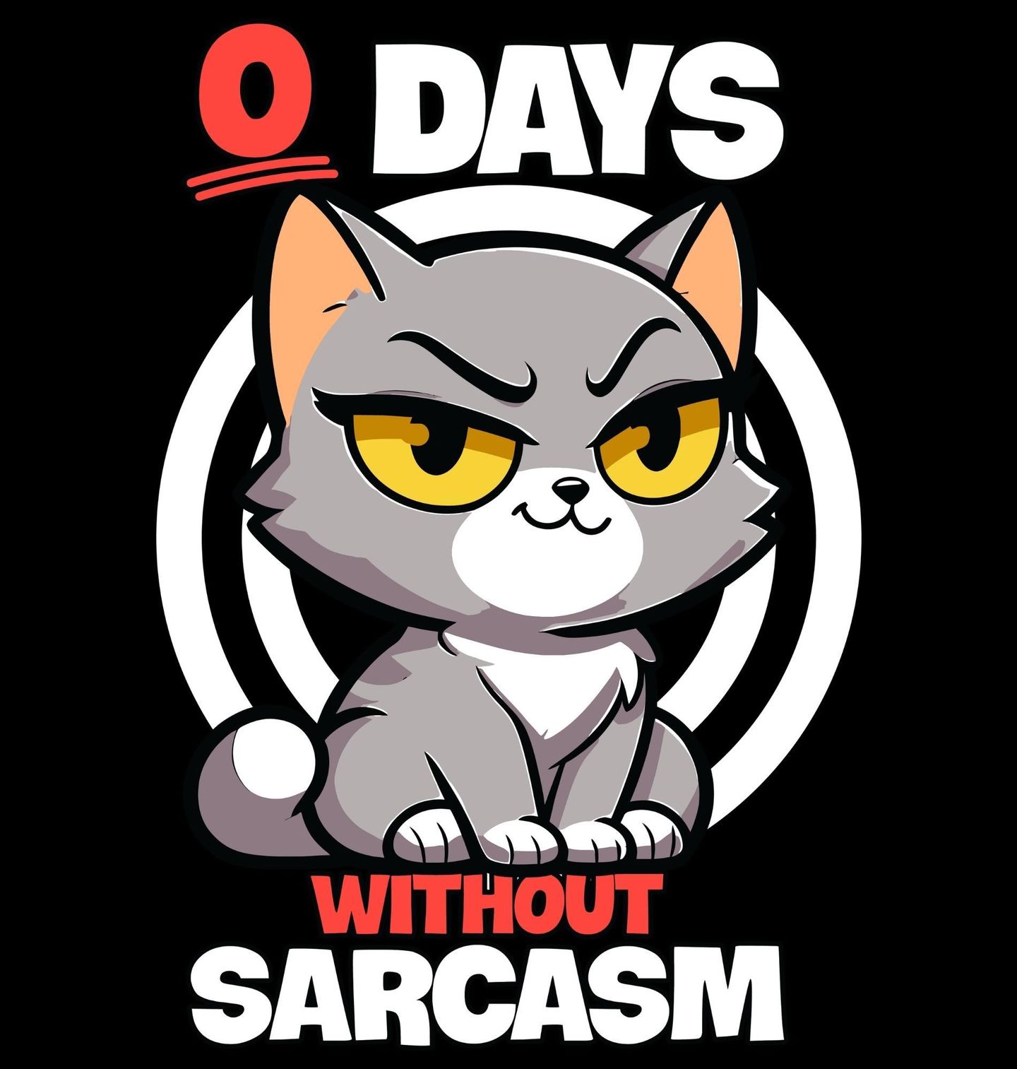 Pánské tričko Bez Sarkasmu ani Den. Vtipný design s kočkou a nápisem “0 DAYS WITHOUT SARCASM” (v překladu „0 dní bez sarkasmu“). Výraz kočky dokonale podtrhuje ironický tón celého motivu. Ideální pro milovníky sarkasmu, koček a ostrého humoru. Skvělý design pro každého, kdo si neodpustí trefnou poznámku.