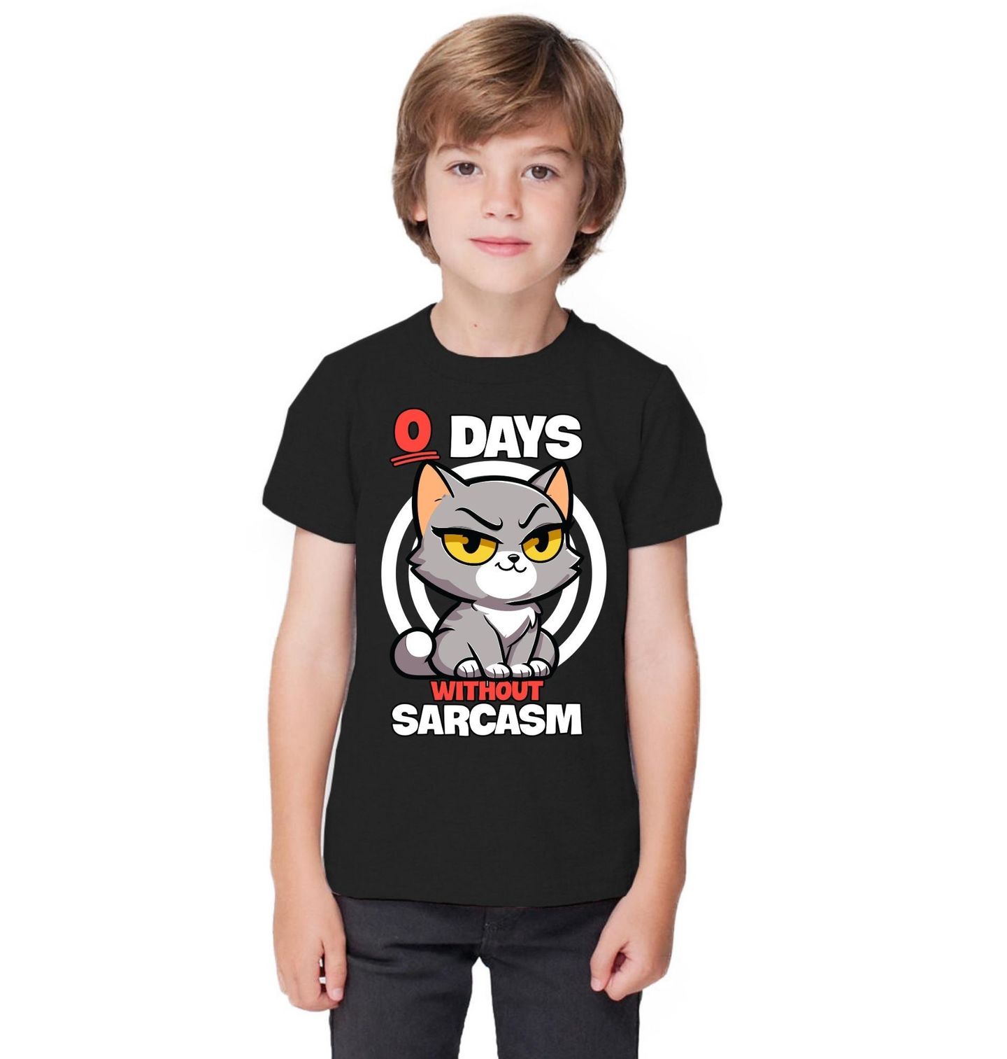 Dětské tričko Bez Sarkasmu ani Den. Vtipný design s kočkou a nápisem “0 DAYS WITHOUT SARCASM” (v překladu „0 dní bez sarkasmu“). Výraz kočky dokonale podtrhuje ironický tón celého motivu. Ideální pro milovníky sarkasmu, koček a ostrého humoru. Skvělý design pro každého, kdo si neodpustí trefnou poznámku.