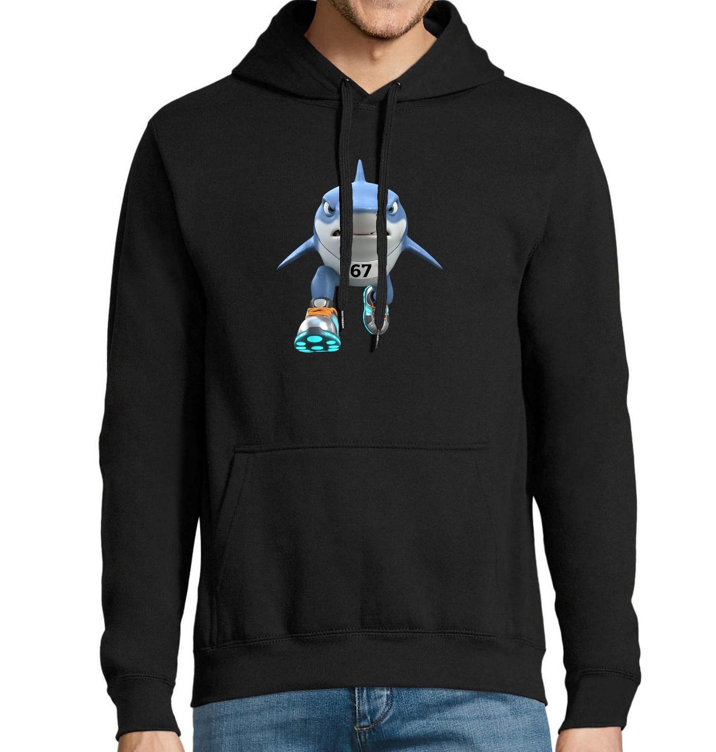 Pánská mikina Běžící Žralok Tralalero Tralala 67 Six Seven. Na motivu je žralok, který má na hrudi startovní číslo 67 a na nohách běžecké boty, takže vizuálně připomíná, jako by běžel závod nebo maraton. Celý obrázek působí jako vtipný meme a zároveň odkazuje na pojem six seven a trend italský brainrot Tralalero Tralala. Jednoduchý, výrazný a zábavný motiv pro všechny fanoušky čísla 67 a žraloků.