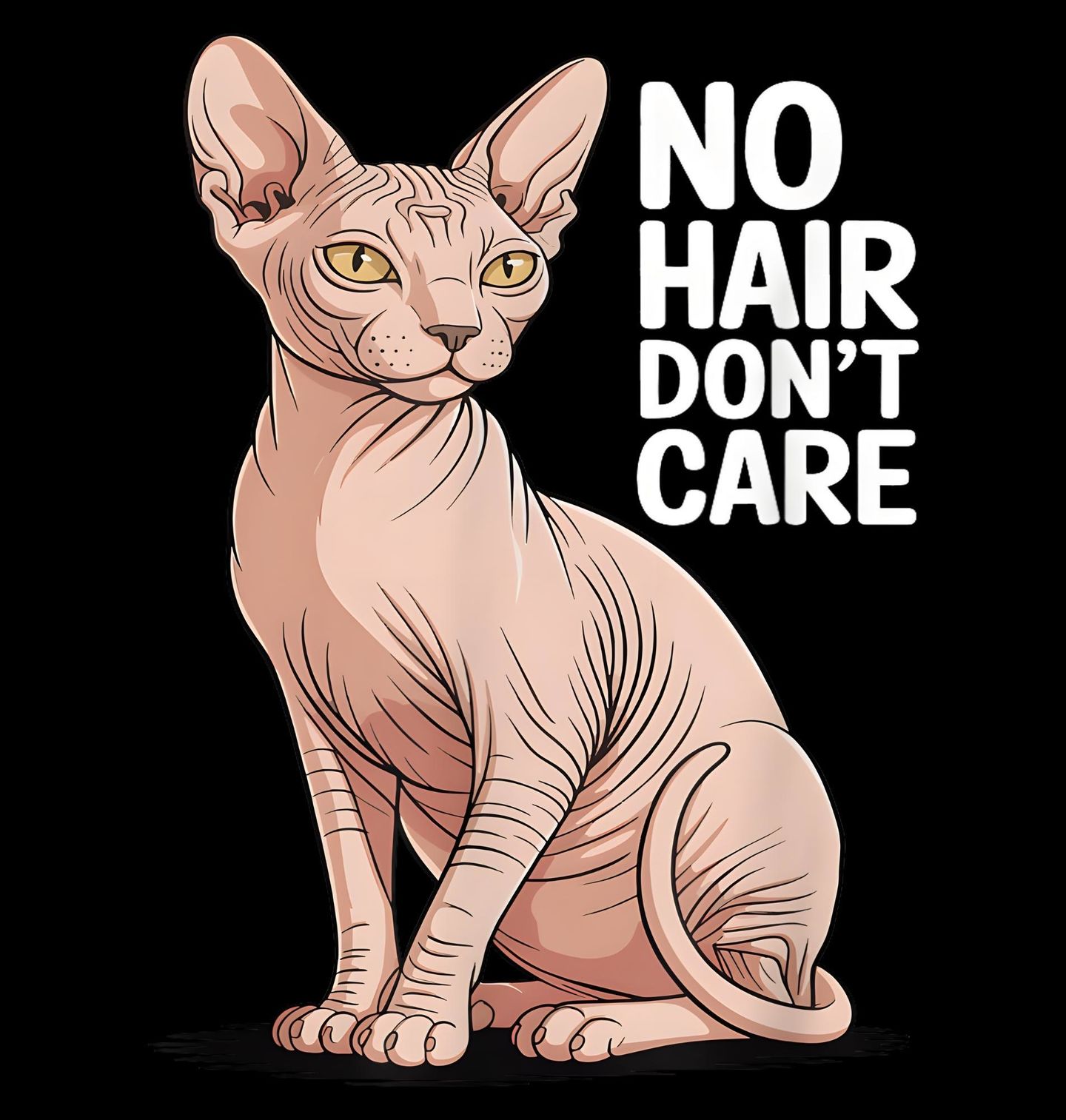 Pánské tričko Bezsrstá Kočka Sphynx. „No hair, don't care“ (česky „Bez chlupů? Nevadí!“) je ideální volbou pro milovníky sphynx koček, originality a sebevědomí. Tahle kočka dokazuje, že krása má mnoho podob – a že i bez chlupů může být zatraceně cool.