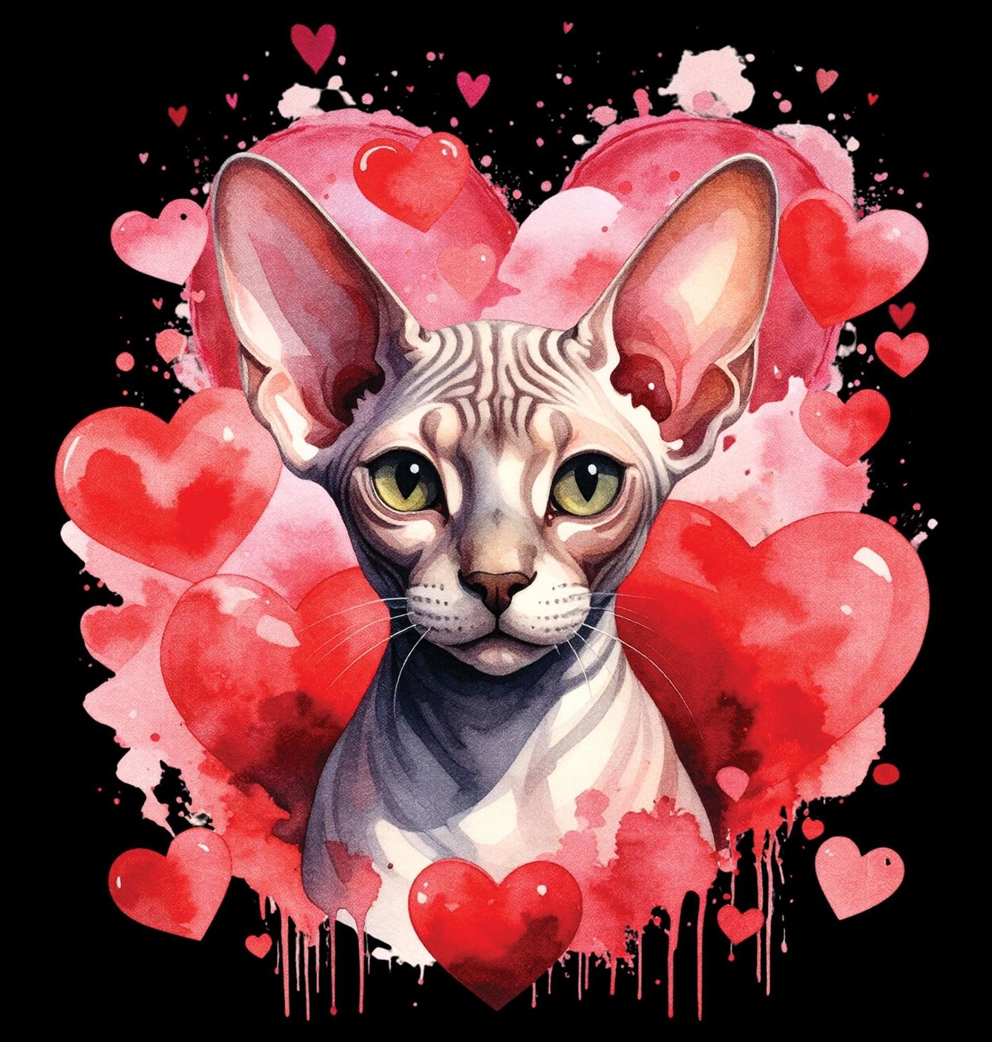 Dámské tričko Bezsrstá Kočka Sphynx mezi Srdci. Tento výrazný a něžný motiv zachycuje kočku obklopenou srdci, která symbolizují lásku, oddanost a jedinečné pouto mezi člověkem a zvířetem. Ilustrace představuje sfingovou kočku (Sphynx) – nezaměnitelnou rasu známou svou bezsrstou kůží, velkými ušima a intenzivním pohledem.