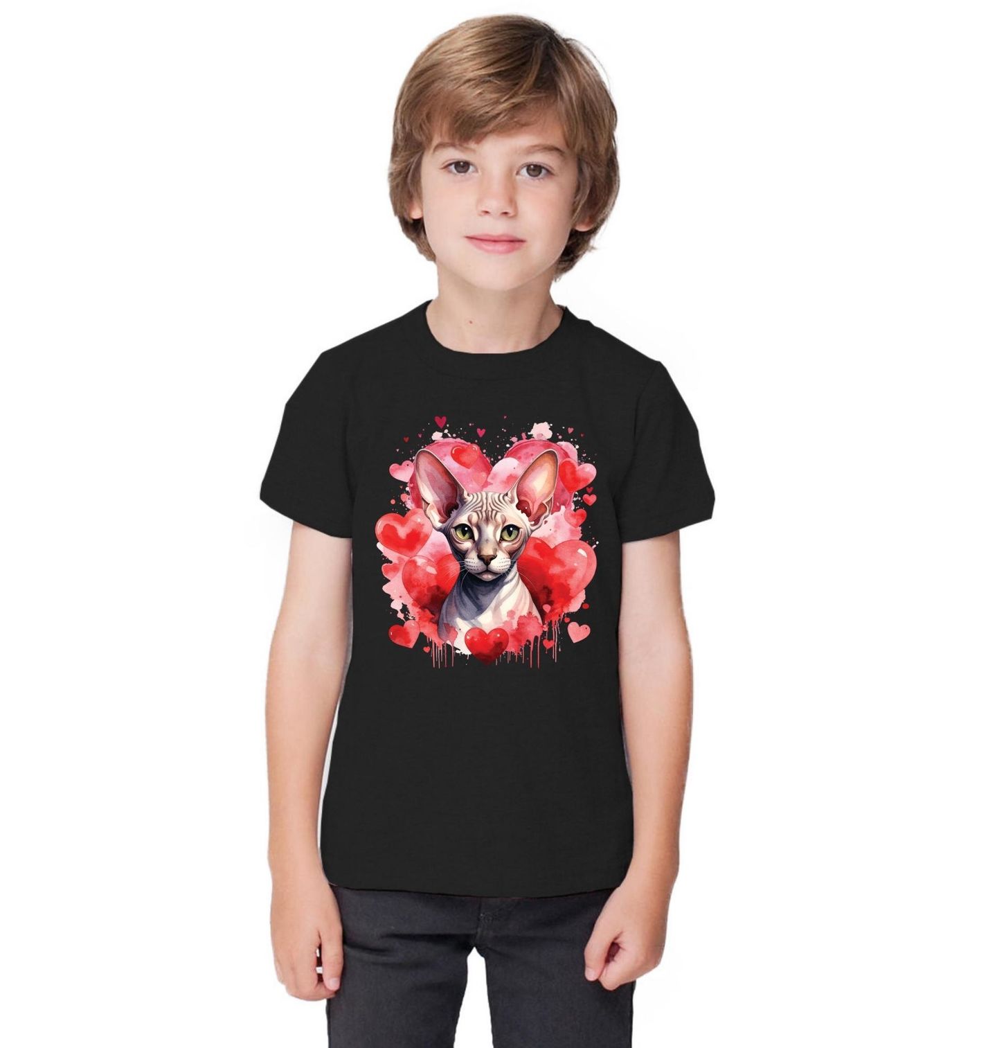 Dětské tričko Bezsrstá Kočka Sphynx mezi Srdci. Tento výrazný a něžný motiv zachycuje kočku obklopenou srdci, která symbolizují lásku, oddanost a jedinečné pouto mezi člověkem a zvířetem. Ilustrace představuje sfingovou kočku (Sphynx) – nezaměnitelnou rasu známou svou bezsrstou kůží, velkými ušima a intenzivním pohledem.