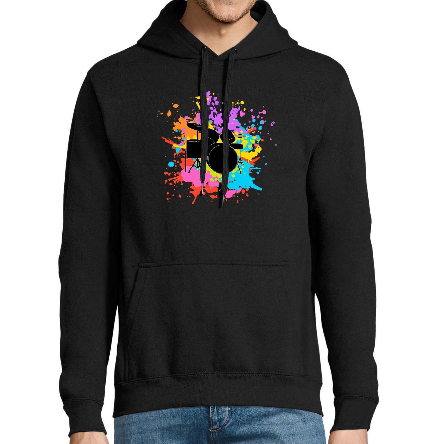 Pánská mikina Bicí Souprava v Rytmu Barev. Originální a stylový motiv, který spojuje bicí a kreativní výbuch barev. Bubny stojí uprostřed abstraktního graffiti pozadí a vytváří jedinečný výraz pro každého milovníka hudby a rytmu. Motiv je ideální pro bubeníky, fanoušky rocku, jazzu i moderní hudby.