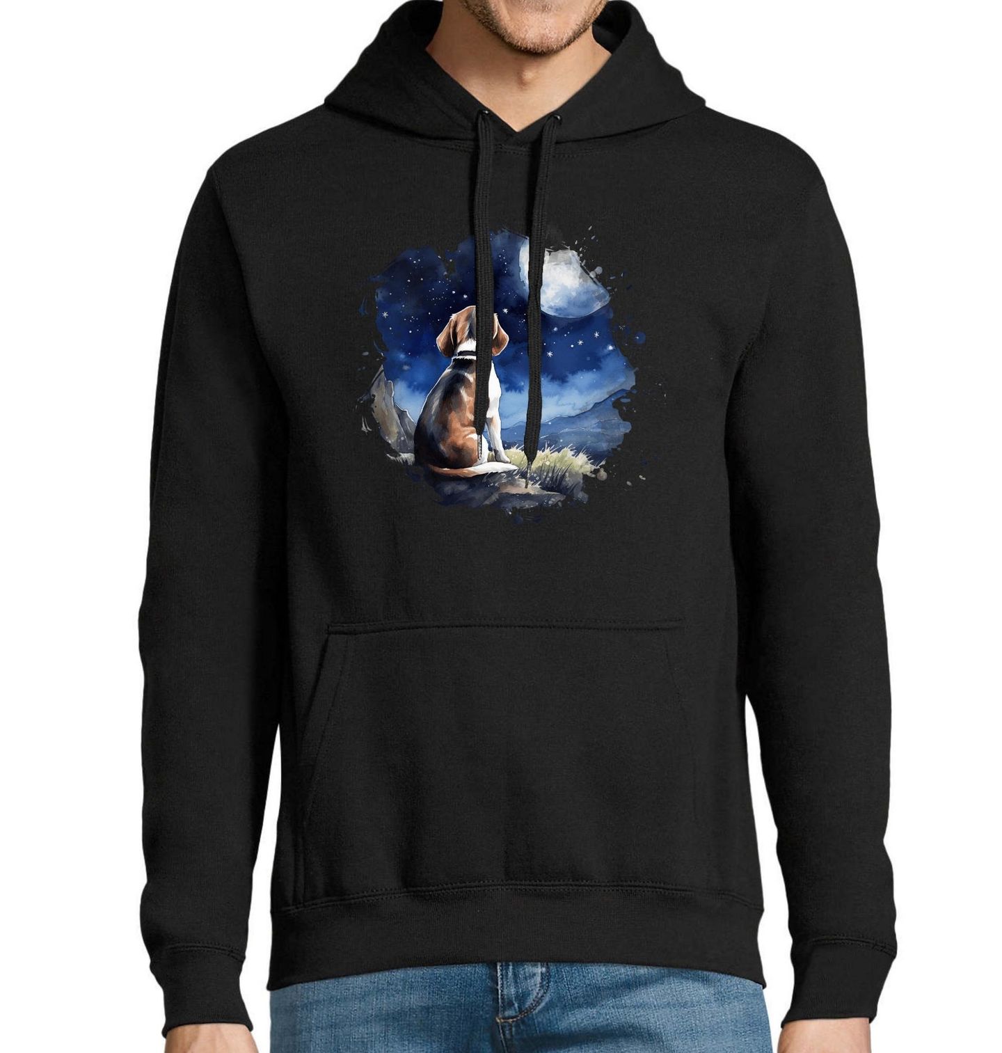 Pánská mikina Bígl pod Hvězdami. Motiv zachycuje klidný okamžik, kdy pes tiše pozoruje noční oblohu pod měsícem. Ideální dárek pro každého pejskaře, který miluje chvíle ticha a propojení se psem v přírodě. Bígl je zde symbolem oddanosti a tichého přemýšlení, které zná každý milovník psů.