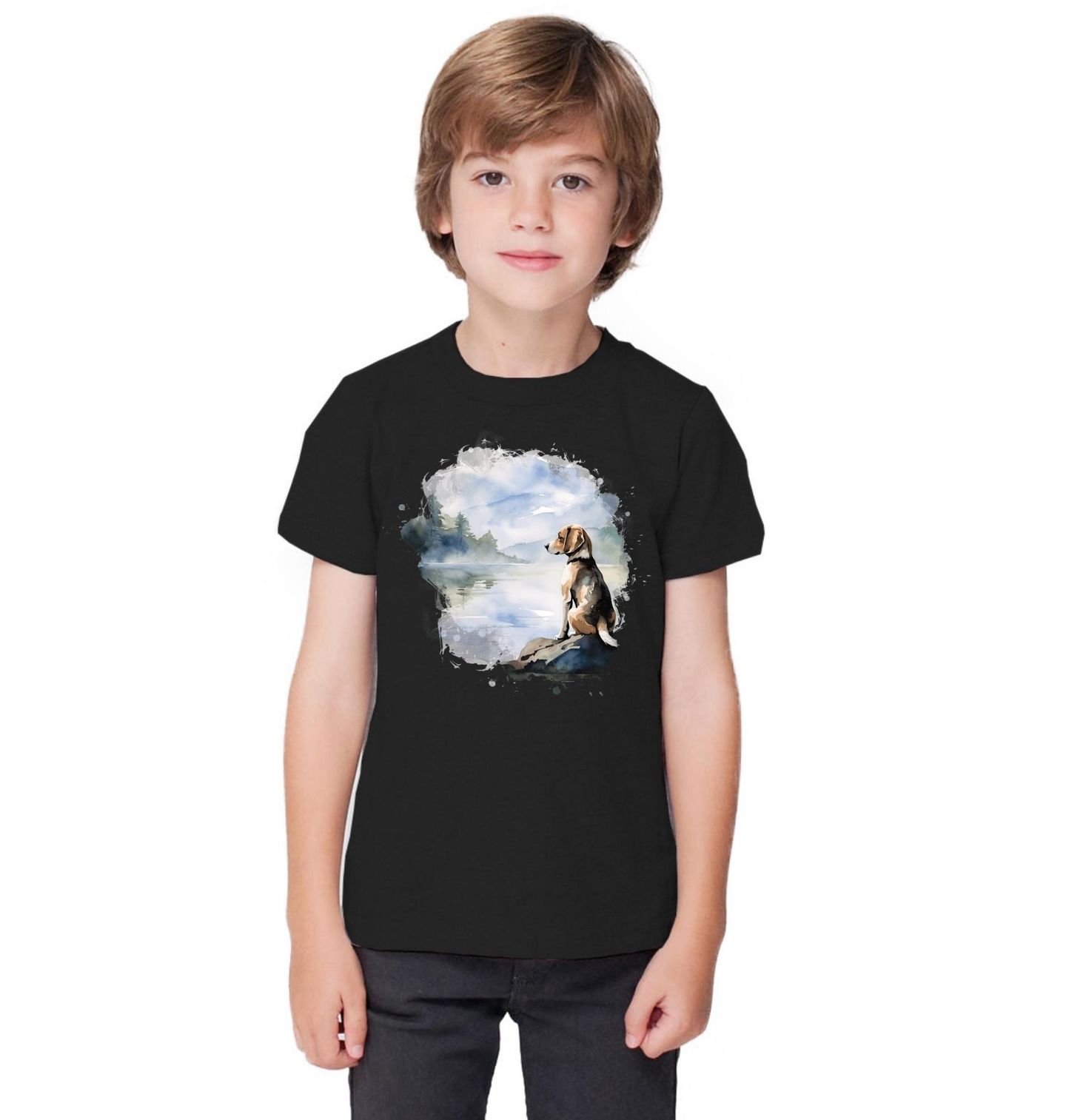 Dětské tričko Bígl u Horského Jezera. Tento klidný a atmosférický motiv zobrazuje psa plemene beagle, který tiše sedí u hladiny jezera a pozoruje okolní krajinu. Jemná akvarelová stylizace podtrhuje pocit harmonie, rozjímání a blízkosti přírody. Motiv osloví každého pejskaře, který má rád vyrovnané, přirozené scény a jeho pes je s ním všude.