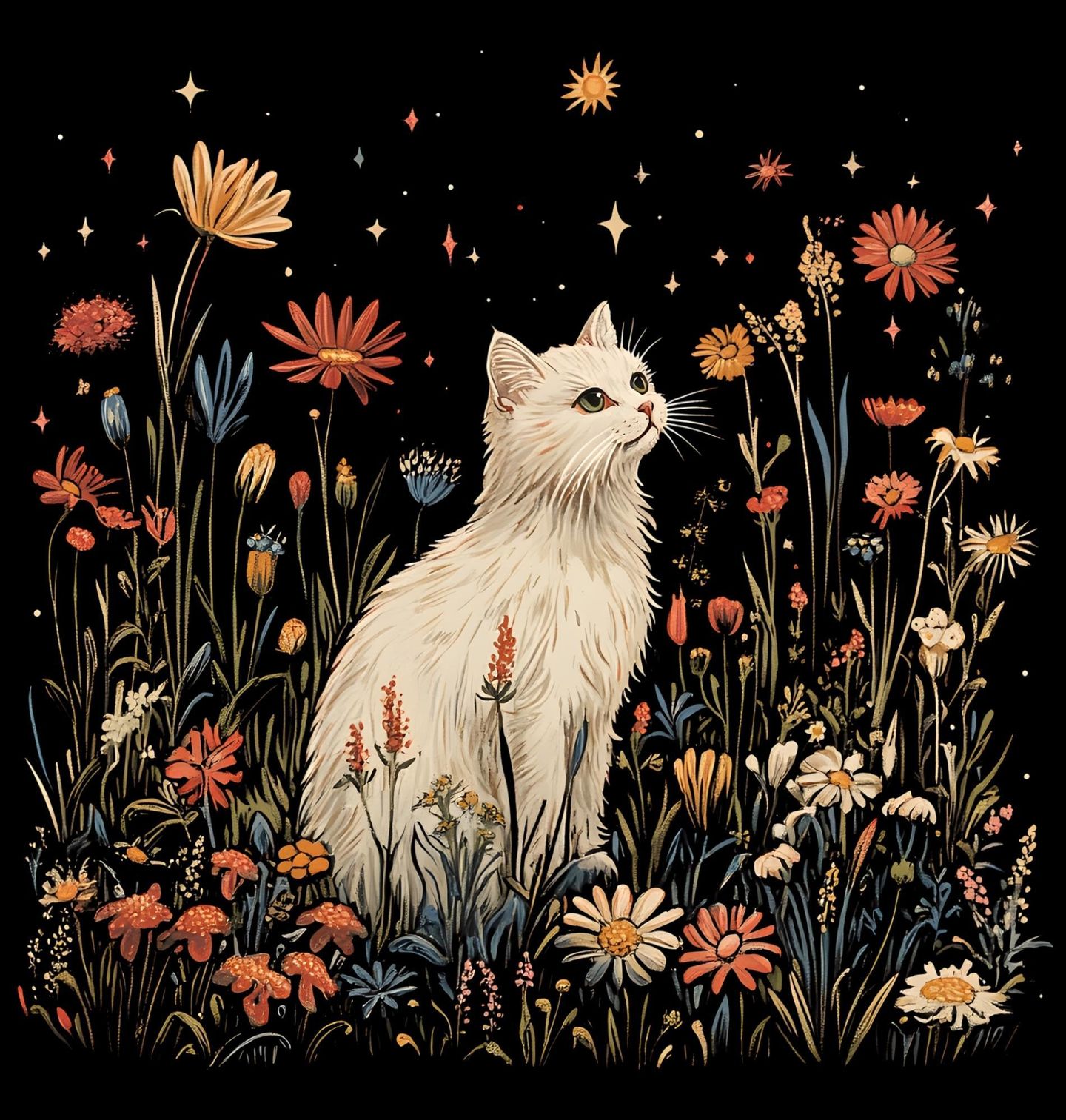 Pánské tričko Bílá Kočka po Hvězdnou Oblohou. Tento snový potisk představuje bílá kočka sedící v záplavě lučních květů pod magickou noční oblohou. Jemné hvězdy a drobné slunce dodávají celému designu pohádková atmosféra a nádech mystika. Tento kousek musí mít každá romantická duše a fanoušek kočky, který rád pozoruje noční nebe. Design působí velmi uklidňujícím dojmem a skvěle doplní váš každodenní outfit. Nechte se okouzlit touto noční scenérií plnou klidu.