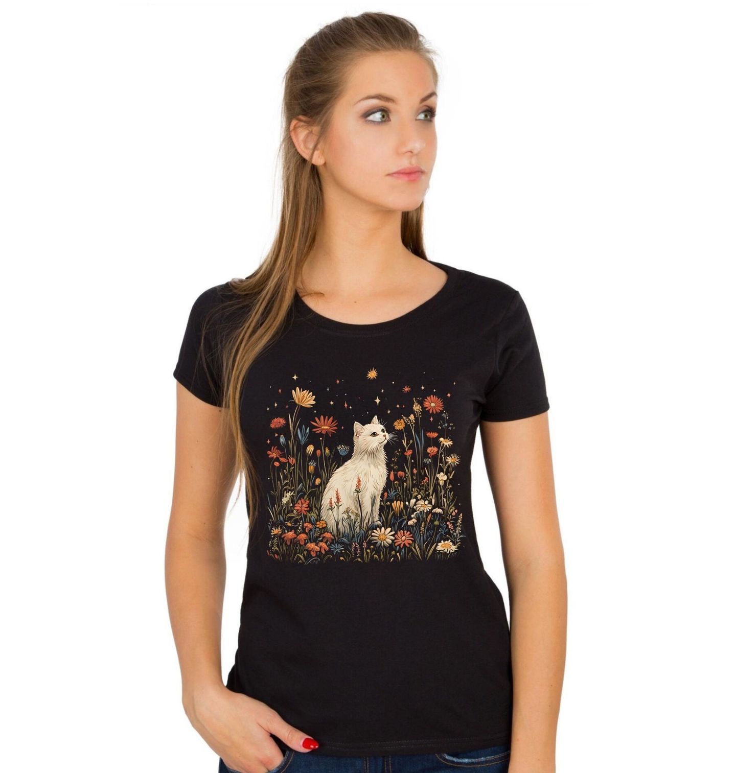 Dámské tričko Bílá Kočka po Hvězdnou Oblohou. Tento snový potisk představuje bílá kočka sedící v záplavě lučních květů pod magickou noční oblohou. Jemné hvězdy a drobné slunce dodávají celému designu pohádková atmosféra a nádech mystika. Tento kousek musí mít každá romantická duše a fanoušek kočky, který rád pozoruje noční nebe. Design působí velmi uklidňujícím dojmem a skvěle doplní váš každodenní outfit. Nechte se okouzlit touto noční scenérií plnou klidu.