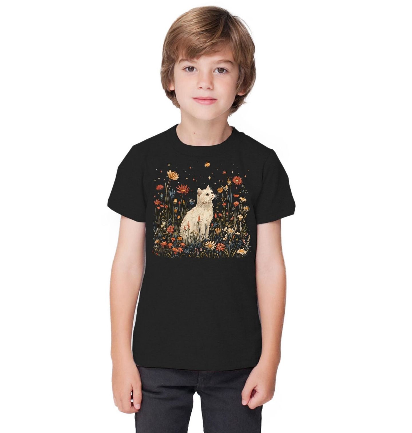 Dětské tričko Bílá Kočka po Hvězdnou Oblohou. Tento snový potisk představuje bílá kočka sedící v záplavě lučních květů pod magickou noční oblohou. Jemné hvězdy a drobné slunce dodávají celému designu pohádková atmosféra a nádech mystika. Tento kousek musí mít každá romantická duše a fanoušek kočky, který rád pozoruje noční nebe. Design působí velmi uklidňujícím dojmem a skvěle doplní váš každodenní outfit. Nechte se okouzlit touto noční scenérií plnou klidu.