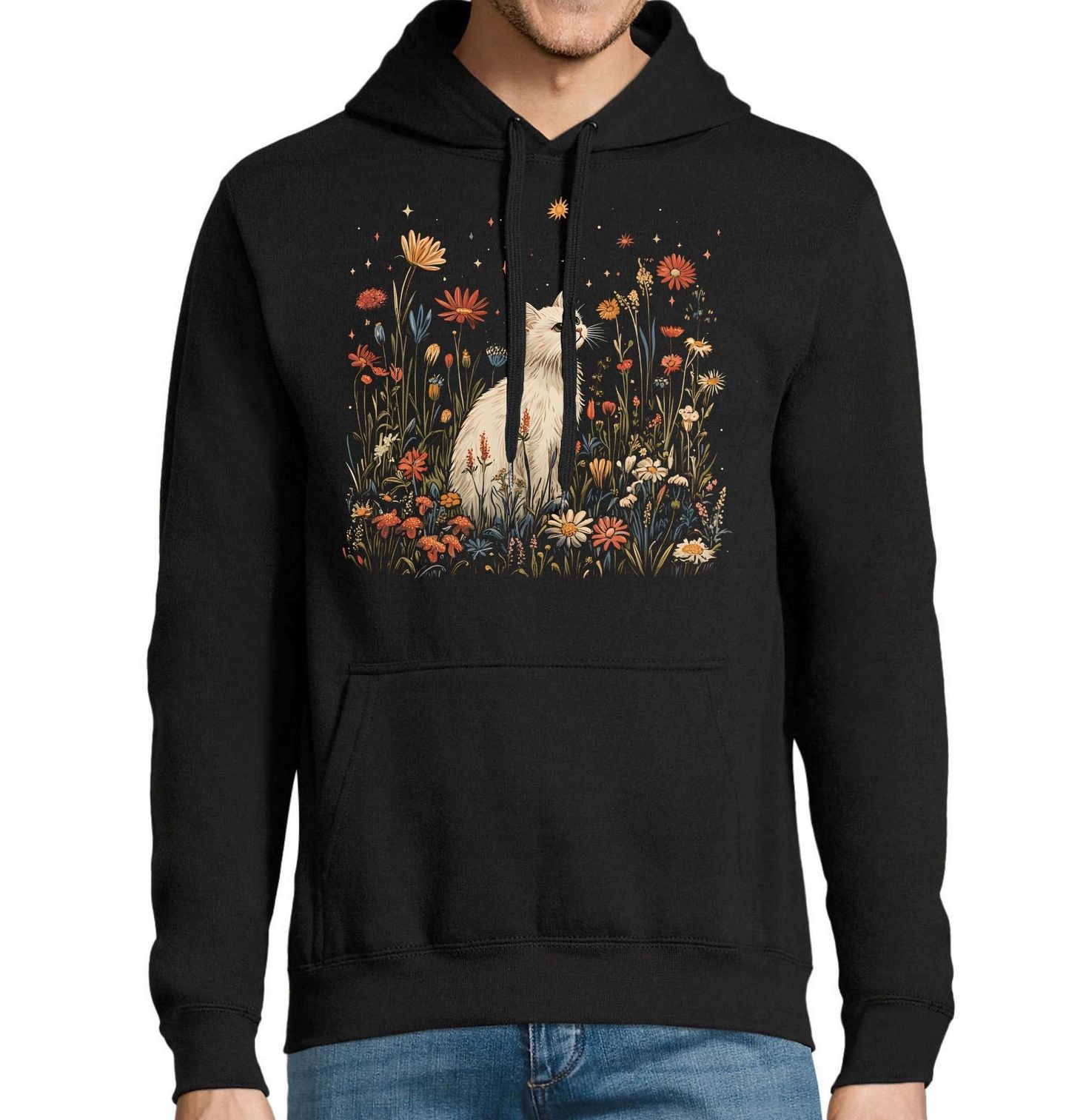 Pánská mikina Bílá Kočka po Hvězdnou Oblohou. Tento snový potisk představuje bílá kočka sedící v záplavě lučních květů pod magickou noční oblohou. Jemné hvězdy a drobné slunce dodávají celému designu pohádková atmosféra a nádech mystika. Tento kousek musí mít každá romantická duše a fanoušek kočky, který rád pozoruje noční nebe. Design působí velmi uklidňujícím dojmem a skvěle doplní váš každodenní outfit. Nechte se okouzlit touto noční scenérií plnou klidu.