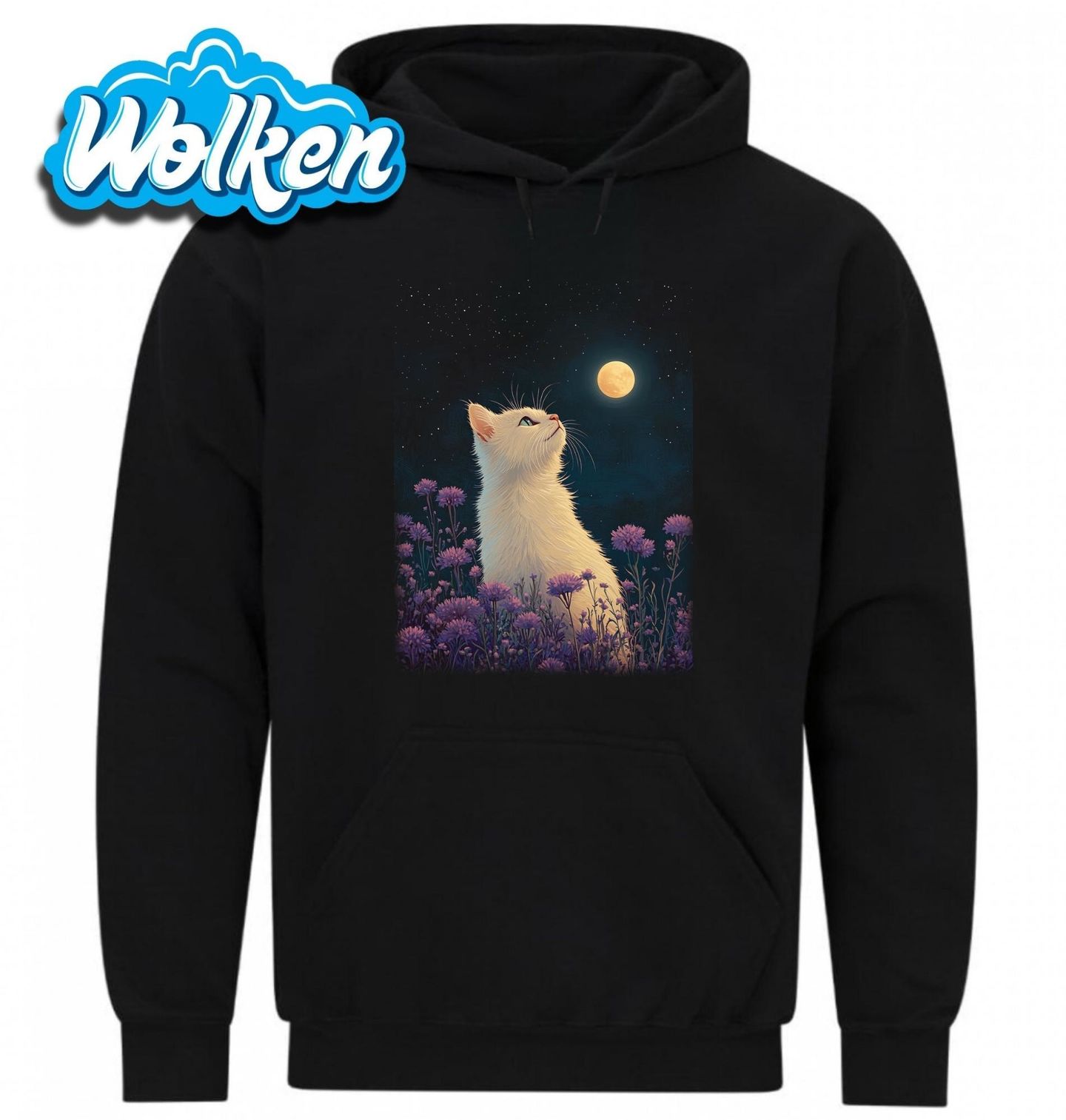 Pánská mikina Bílá kočka pod Měsícem. Ponoř se do kouzla noční zahrady, kde bílá kočka snivě vzhlíží k Měsíci obklopená mořem fialových květin. Toto tričko je ideální pro milovníky koček, tajemných nocí a poetických momentů pod hvězdnou oblohou. Měsíc, bílá kočka a fialové květiny tvoří harmonický motiv, který zaujme na první pohled.
