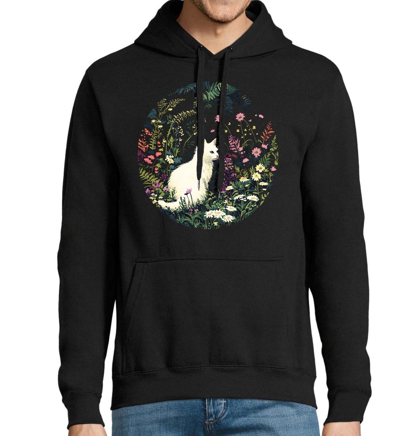 Pánská mikina Bílá Kočka v Rozkvetlé Zahradě. Tento malebný potisk zachycuje bílá kočka uprostřed divoké zahrady plné barevných květin a kapradí. Kruhová kompozice a syté barvy na tmavém pozadí vytvářejí nádherný vizuální kontrast. Tento kousek musí mít každý milovník příroda a kočky s láskou pro umělecký styl. Je to ideální volba pro rozjasnění vašeho šatníku jemným a poetickým motivem. Oblečte si kousek rozkvetlá louka, která nikdy neuvadne.