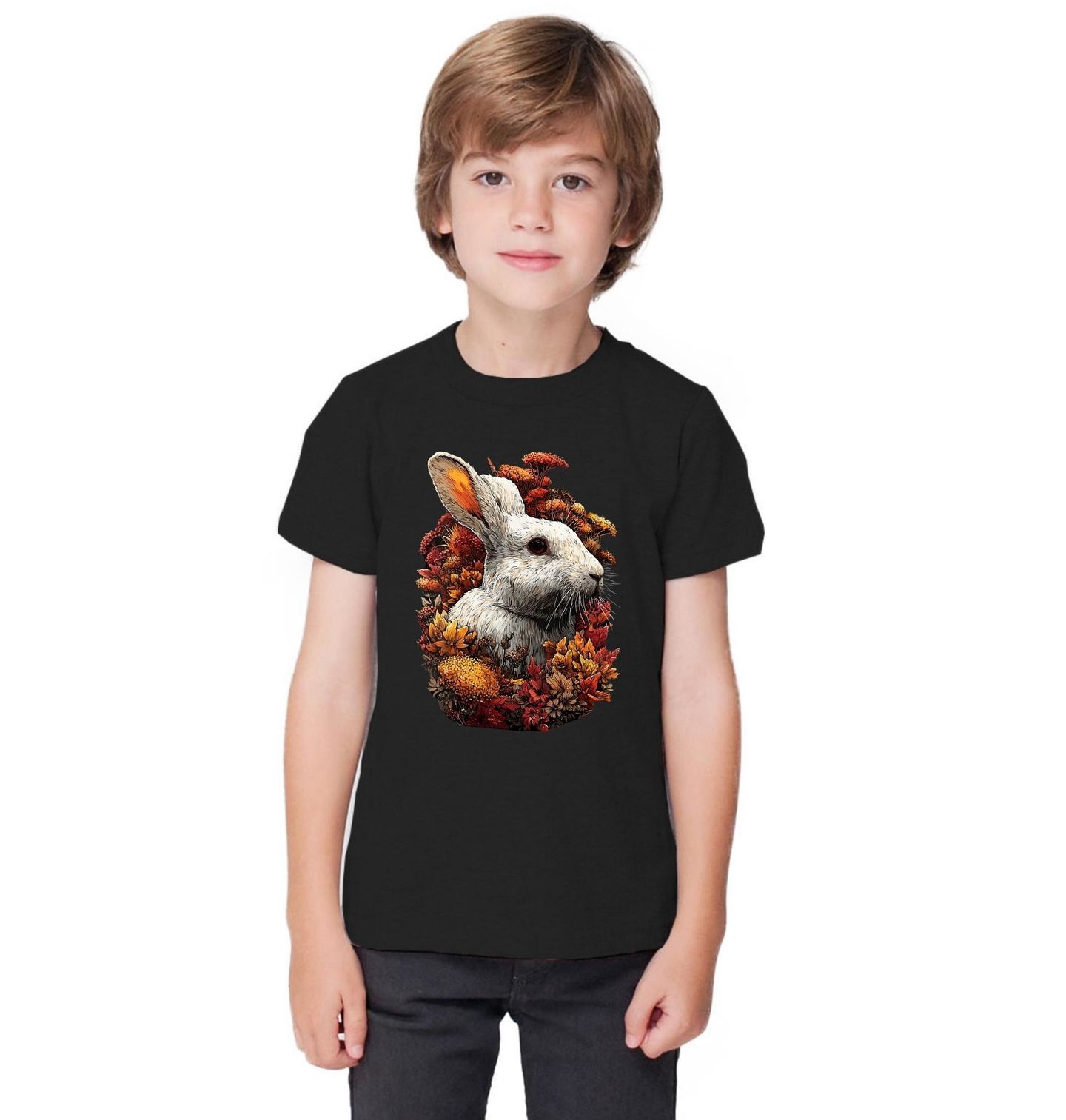 Dětské tričko Bílý Králík v Listí. Tenhle nádherný motiv zachycuje bílého králíka obklopeného barevným podzimním listím v odstínech oranžové, červené a zlaté. Ilustrace je laděná do teplých tónů a připomíná kouzelný podzim, kdy příroda hraje všemi barvami. Ideální design pro milovníky zvířat, přírody a podzimní atmosféry.