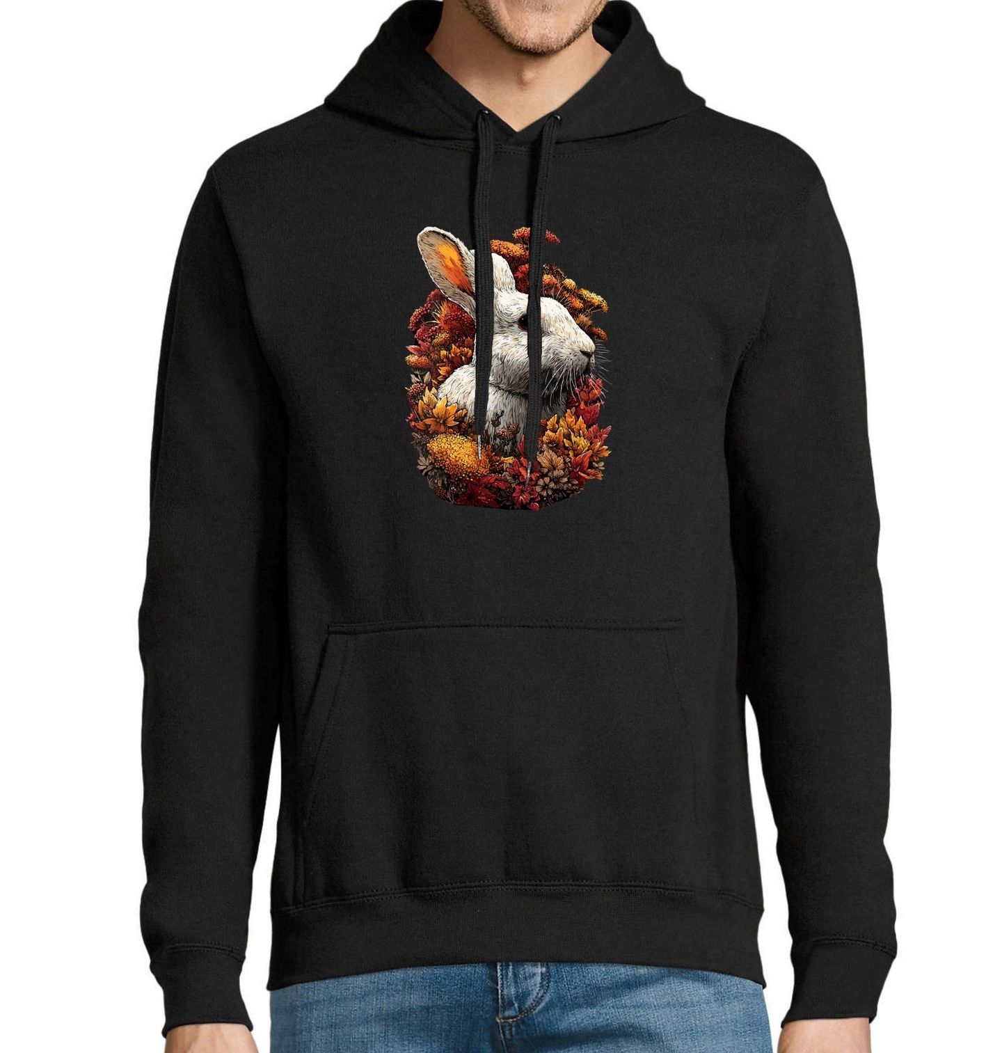 Pánská mikina Bílý Králík v Listí. Tenhle nádherný motiv zachycuje bílého králíka obklopeného barevným podzimním listím v odstínech oranžové, červené a zlaté. Ilustrace je laděná do teplých tónů a připomíná kouzelný podzim, kdy příroda hraje všemi barvami. Ideální design pro milovníky zvířat, přírody a podzimní atmosféry.