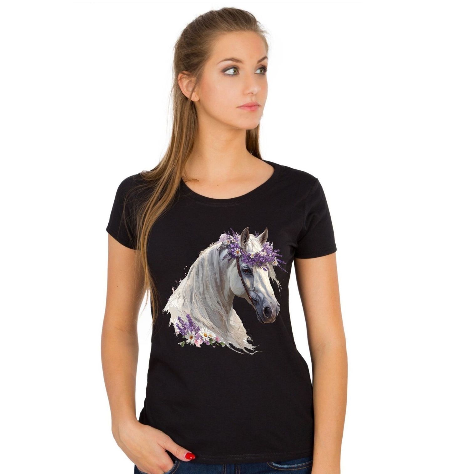 Dámské tričko Bílý Kůň s Květinovou Korunou. Jemný a romantický motiv zachycuje nádherný portrét, kde dominuje elegantní kůň ozdobený květinovou korunou v přírodních barvách. Detailní ilustrace zvýrazňuje klid, krásu a ušlechtilost, kterou symbolizuje právě kůň, a vytváří harmonický design vhodný pro každodenní nošení i jako originální dárek.