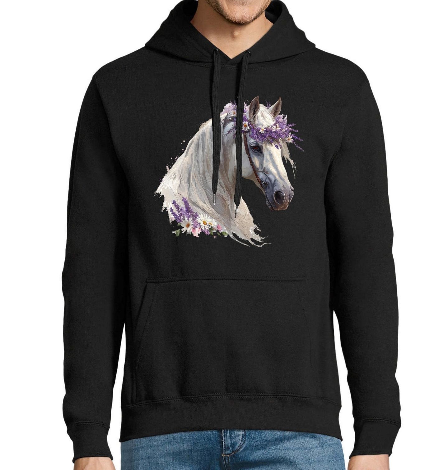Pánská mikina Bílý Kůň s Květinovou Korunou. Jemný a romantický motiv zachycuje nádherný portrét, kde dominuje elegantní kůň ozdobený květinovou korunou v přírodních barvách. Detailní ilustrace zvýrazňuje klid, krásu a ušlechtilost, kterou symbolizuje právě kůň, a vytváří harmonický design vhodný pro každodenní nošení i jako originální dárek.