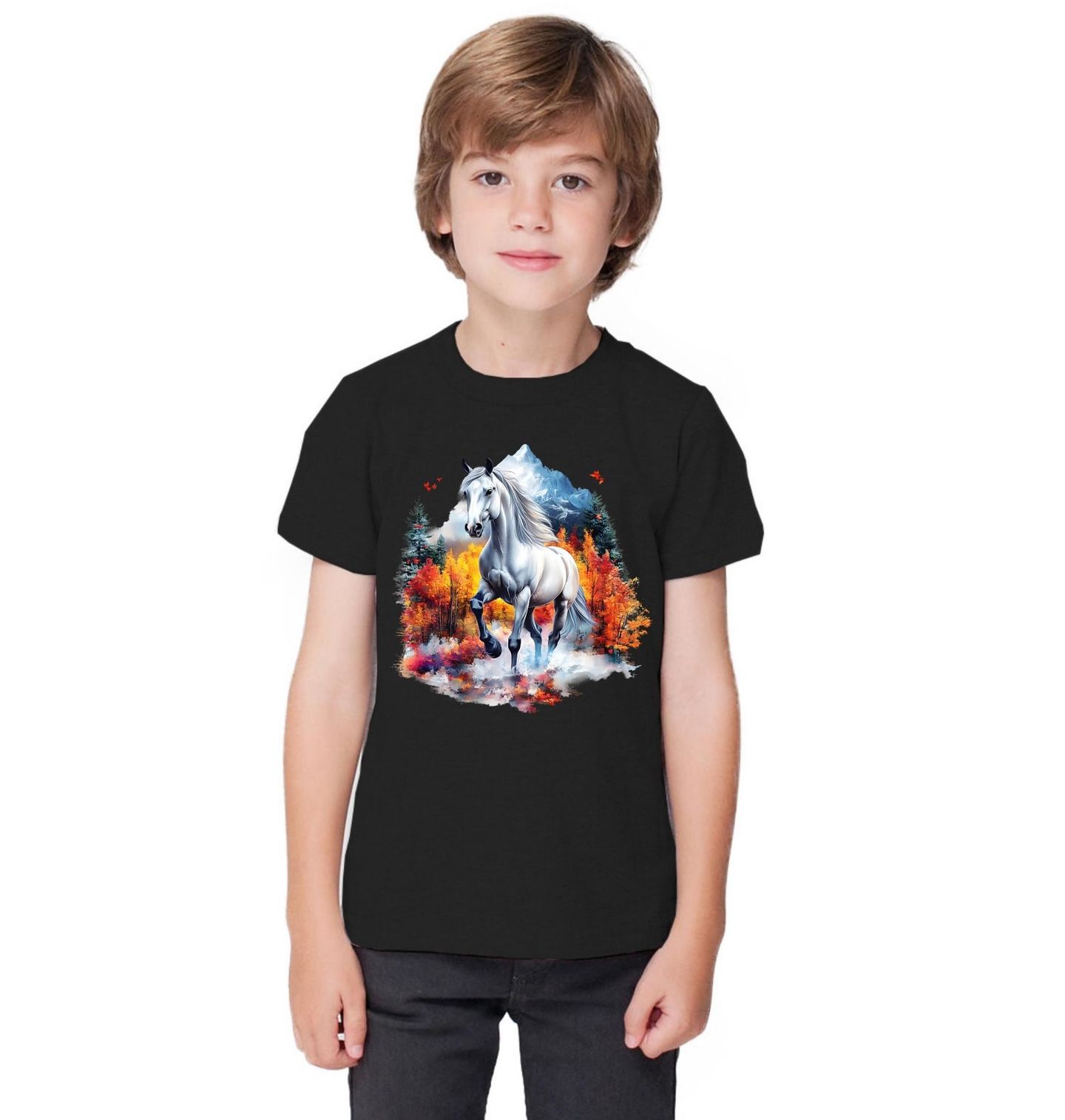 Dětské tričko Bílý Kůň v Podzimním Lese. Tento výrazný motiv zachycuje majestátní kůň v pohybu, obklopený barevným podzimním les a dramatickým panorama, které tvoří mohutné hory v pozadí. Elegantní bílý kůň působí silně, svobodně a zároveň harmonicky v kontrastu s ohnivými odstíny stromů a chladnou krásou horských štítů.