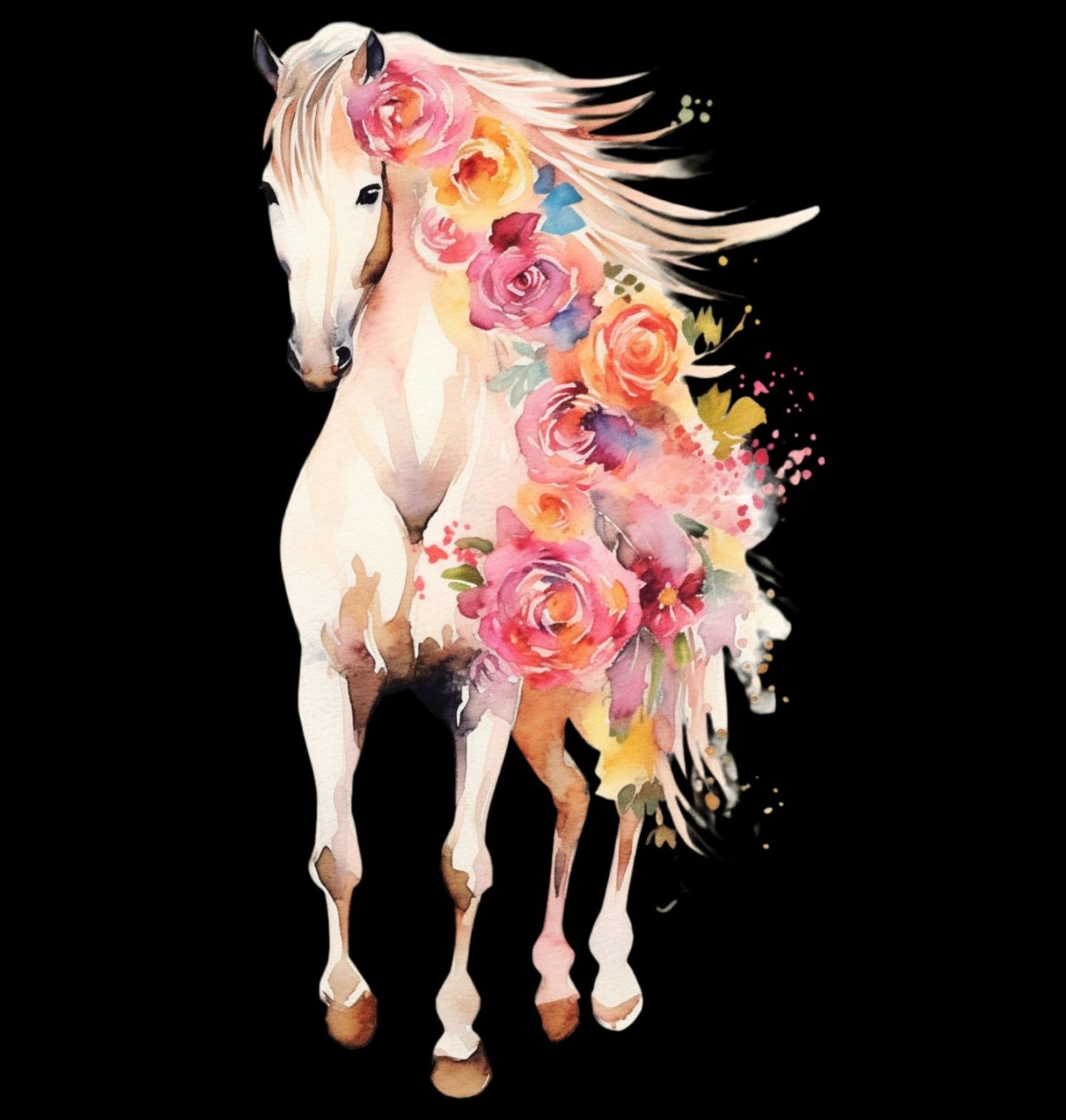 Dámské tričko Bílý Květinový Kůň. Romantický motiv v akvarelovém stylu spojuje něžnost přírody a krásu zvířat. Dominantou designu je elegantní kůň, jehož siluetu zdobí barevné květiny v jemných pastelových tónech. Ilustrace působí lehce, vzdušně a zároveň výrazně, takže skvěle vynikne na oblečení i doplňcích.