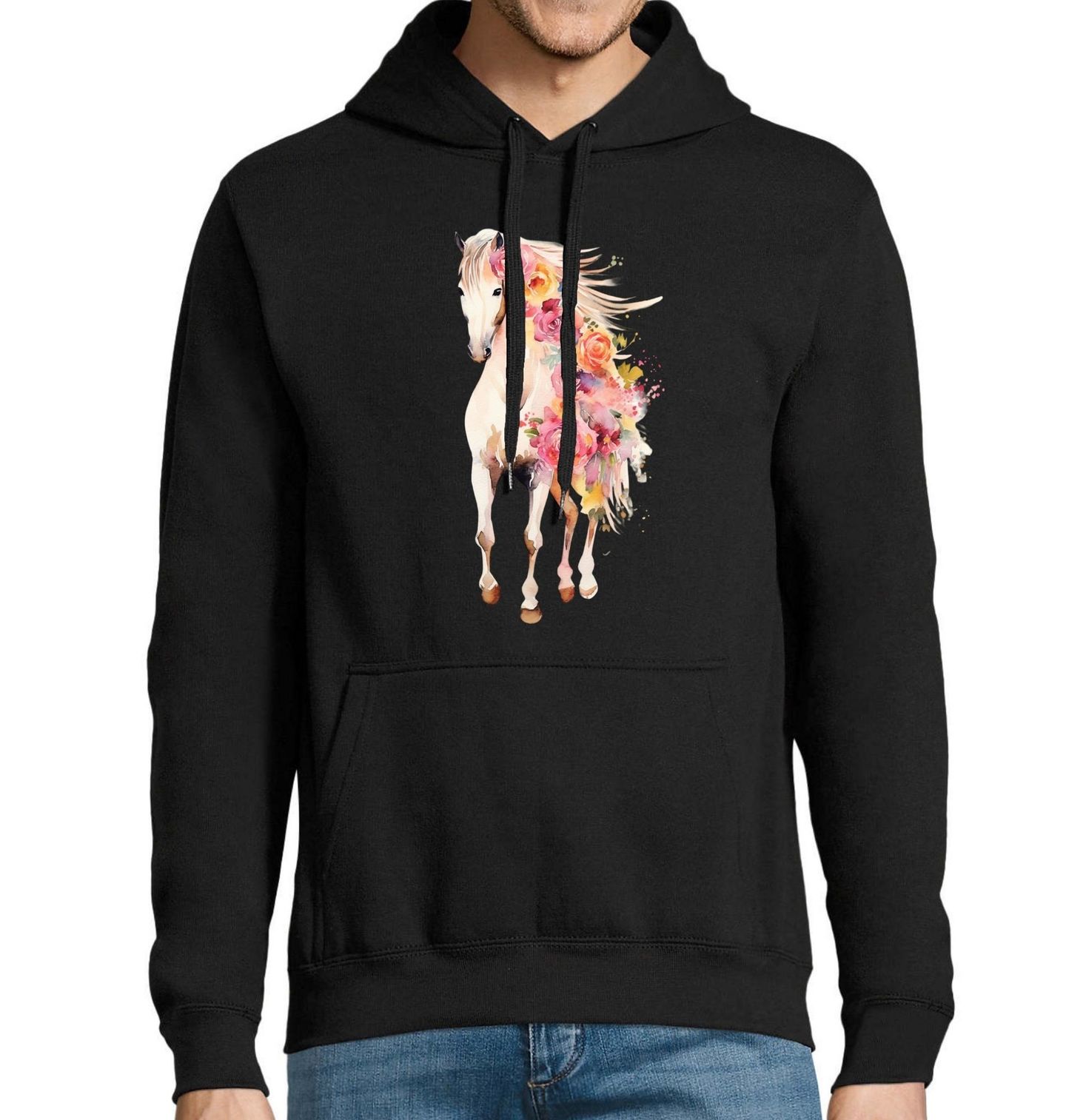 Pánská mikina Bílý Květinový Kůň. Romantický motiv v akvarelovém stylu spojuje něžnost přírody a krásu zvířat. Dominantou designu je elegantní kůň, jehož siluetu zdobí barevné květiny v jemných pastelových tónech. Ilustrace působí lehce, vzdušně a zároveň výrazně, takže skvěle vynikne na oblečení i doplňcích.