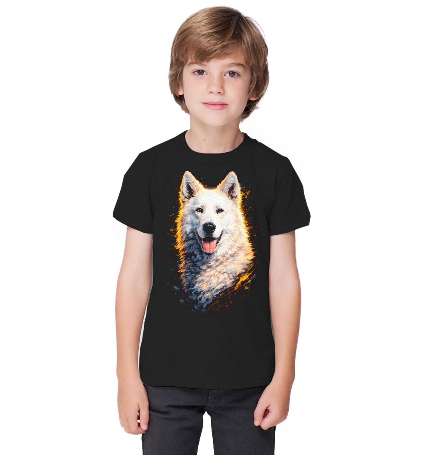 Dětské tričko Bílý švýcarský ovčák. Tento majestátní pes zaujme svou hustou bílou srstí, bystrým pohledem a přátelským výrazem, který si okamžitě získá každého milovníka psů. Každý pejskař ocení detailní zpracování srsti i výraz očí, které vystihují inteligentní a oddanou povahu tohoto plemene. Bílý švýcarský ovčák je známý svou učenlivostí, vyrovnaností a silným vztahem ke své rodině, díky čemuž je nejen skvělým společníkem, ale i spolehlivým ochráncem.