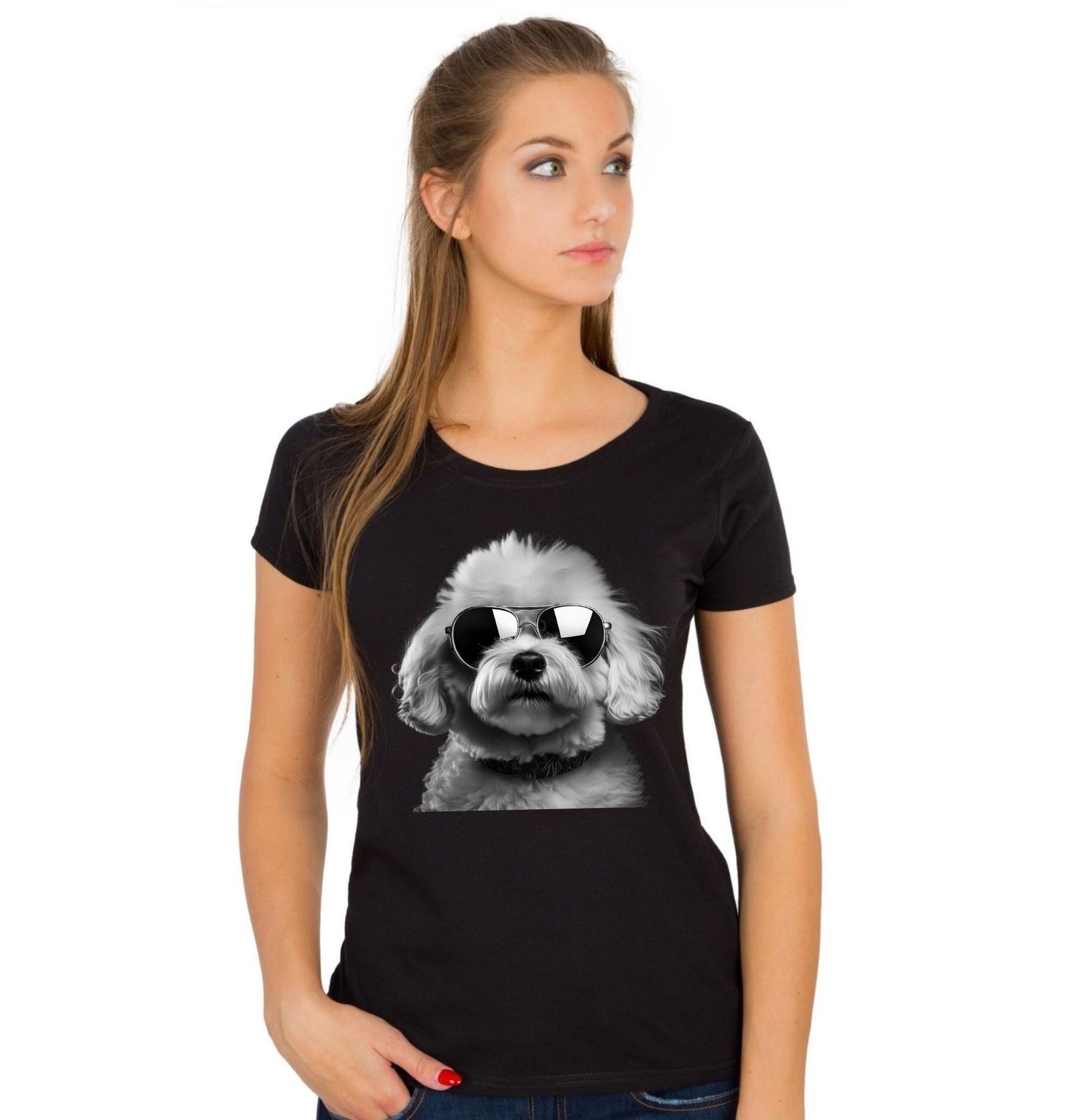 Dámské tričko Bišonek s Brýlemi. Tento elegantní pes s výrazem plným sebevědomí potěší každého, kdo je skutečný pejskař a chce ukázat svou lásku ke čtyřnohým parťákům. Bišonek je známý svou jemnou srstí, přátelskou povahou a veselým charakterem, což dělá z tohoto motivu ideální doplněk pro každodenní nošení.