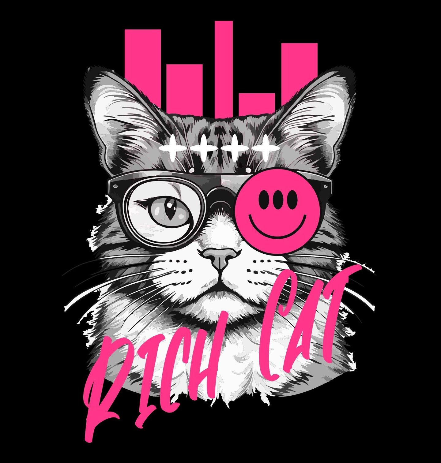 Pánské tričko Bohatá Kočka Rich Cat. Moderní a výrazný motiv „kočka Rich Cat“ přináší kombinaci stylu, sebevědomí a hravé estetiky. Ilustrace zobrazuje postavu, kterou je kočka s brýlemi a ikonickými prvky, doplněná o výrazné grafické detaily a neonové barvy. Celý design působí trendy, uvolněně a lehce provokativně.