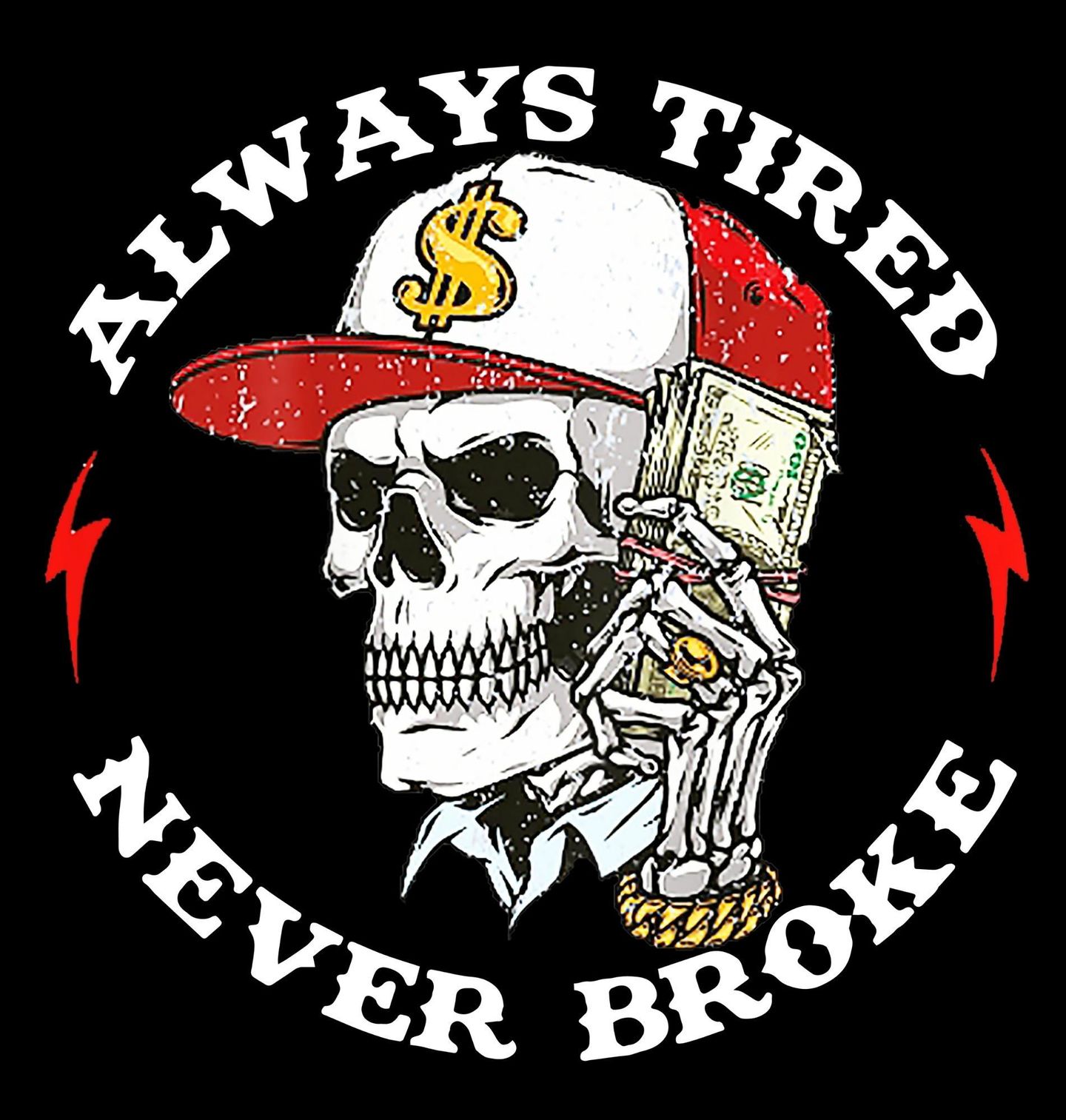 Dámské tričko Bohatý Kostlivec Always Tired, Never Broke. „Vždycky unavený, nikdy chudý“ - „Always Tired, Never Broke“ zobrazuje kostlivce s kšiltovkou, zlatým řetězem a svazkem dolarů. Tahle rebelská lebka v hip-hop stylu osloví každého, kdo si jede svůj grind i po smrti. Ideální pro fanoušky streetwearu, sarkasmu a černého humoru.