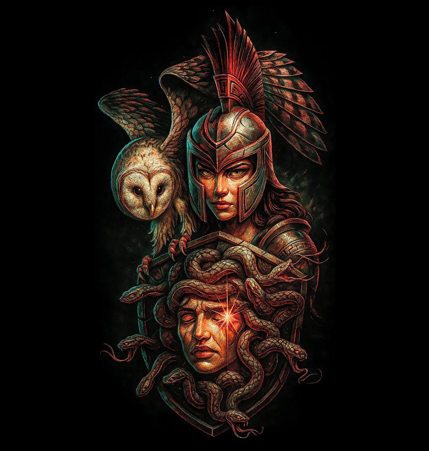 Dámské tričko Bohyně Athéna a Štít z Hlavy Medúzy. Ústřední postavou je Athéna, dcera Dia, ochránkyně měst, hrdinů a spravedlnosti. Sova po jejím boku představuje inteligenci a prozíravost. Medúza, jedna z Gorgon, jejíž pohled měnil lidi v kámen, je zde zobrazena jako poražená síla chaosu, kterou Athéna proměnila v nástroj ochrany. Řecká mytologie spojuje sílu, moudrost a mystickou symboliku