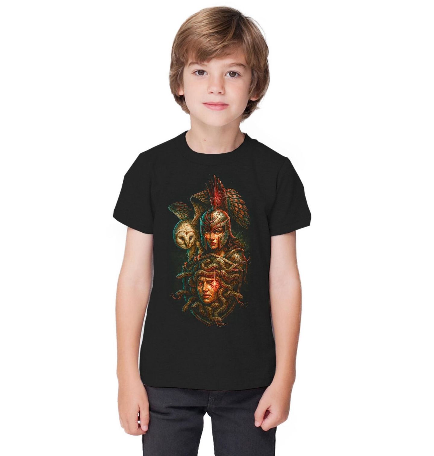 Dětské tričko Bohyně Athéna a Štít z Hlavy Medúzy. Ústřední postavou je Athéna, dcera Dia, ochránkyně měst, hrdinů a spravedlnosti. Sova po jejím boku představuje inteligenci a prozíravost. Medúza, jedna z Gorgon, jejíž pohled měnil lidi v kámen, je zde zobrazena jako poražená síla chaosu, kterou Athéna proměnila v nástroj ochrany. Řecká mytologie spojuje sílu, moudrost a mystickou symboliku