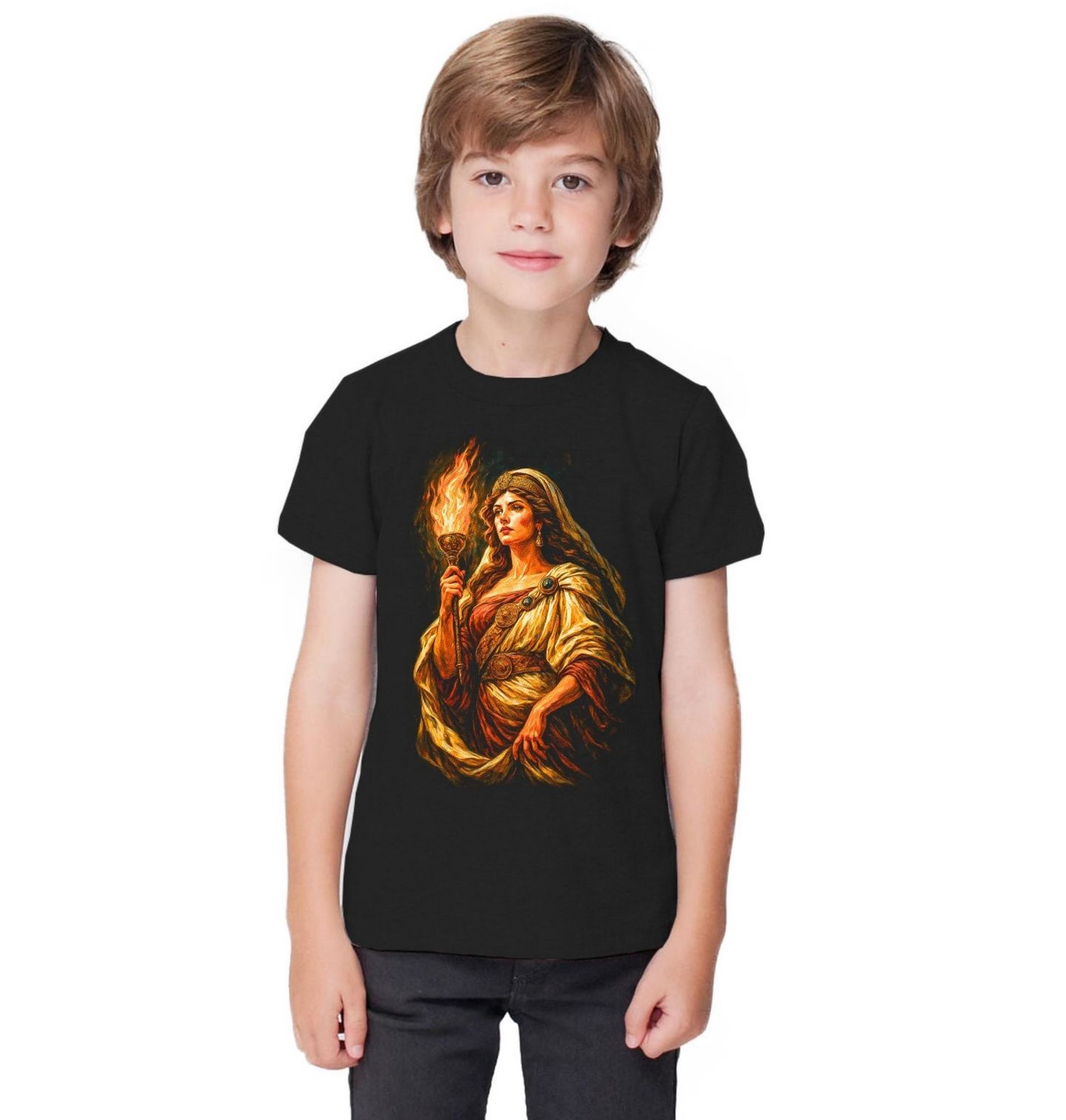 Dětské tričko Bohyně Hestia Plamen Věčného Domova. Hestia je řecká panenská bohyně domácího krbu, rodiny a domova. V ruce drží posvátný oheň - každý řecký dům i chrám měl svůj plamen zasvěcený právě jí. Nepředstavovala válku ani vášeň, ale stabilitu, harmonii a klid – základ každé civilizace. Na rozdíl od ostatních olympských bohů zůstávala stranou konfliktů a symbolizovala rovnováhu. Otec Kronos ji pozřel, stejně jako její sourozence kromě Dia.