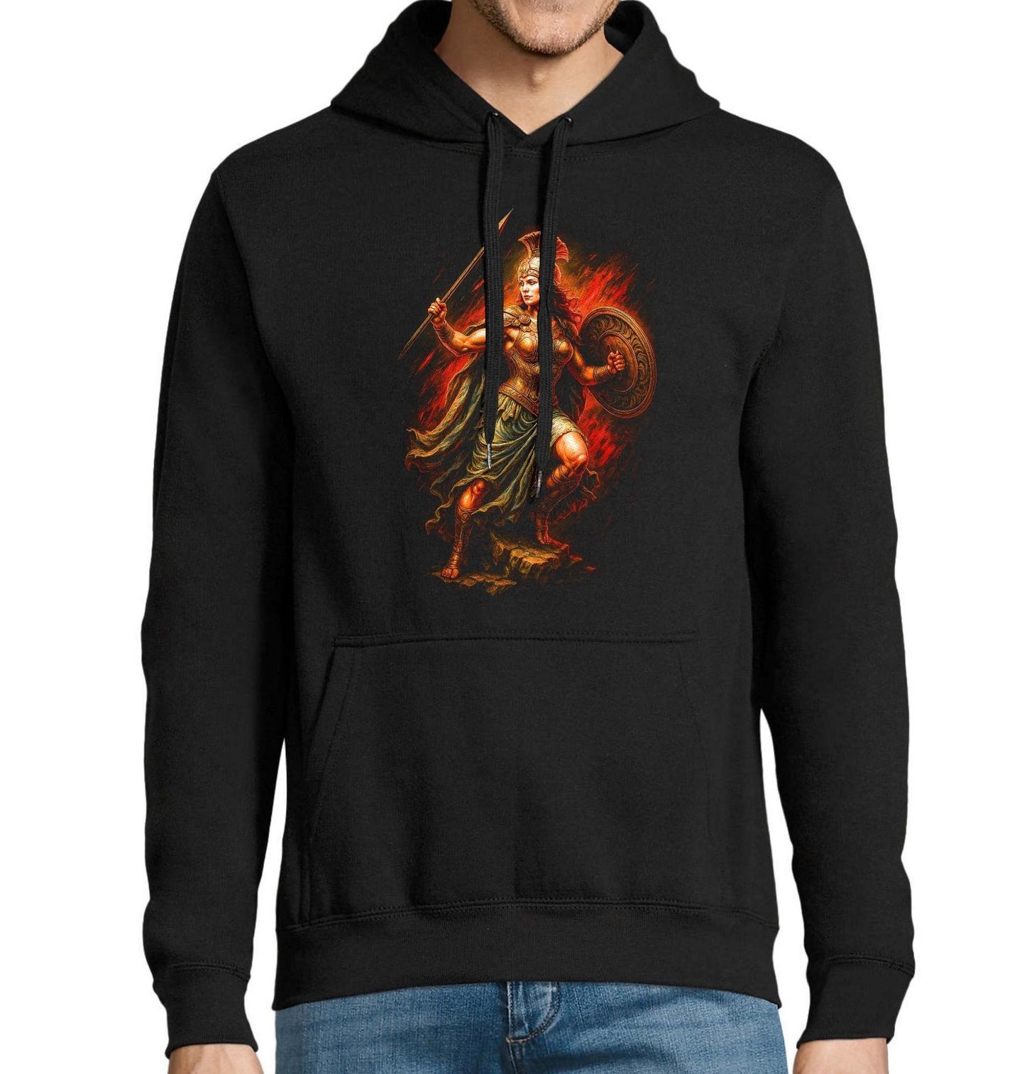 Pánská mikina Bohyně Války Athéna. Pallas Athéna je v řecké mytologii dcera nejvyššího boha Dia. Athéna je v řecké mytologii bohyní moudrosti, strategie, řemesel a spravedlivé války. Symbolizuje inteligenci, odvahu, rozvahu a vnitřní sílu – ideální motiv pro všechny, kteří chtějí vyjádřit svou nezávislost, odhodlání a silnou osobnost.
