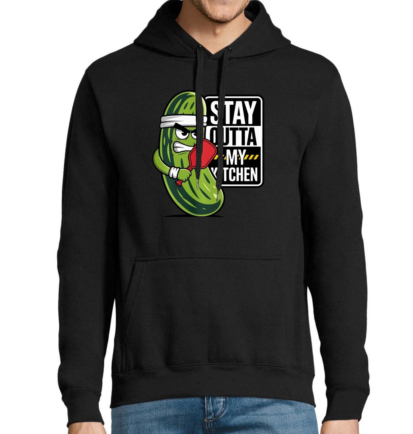 Pánská mikina Bojová Okurka Stay Outta My Kitchen. Motiv rozzlobené okurky s pálkou a nápisem „Stay Outta My Kitchen“ (v překladu „Drž se dál od mé kuchyně“) přináší jedinečný mix kuchyňského humoru a bojovného ducha. Skvělá volba pro milovníky zeleniny, vaření nebo pro každého kuchaře.