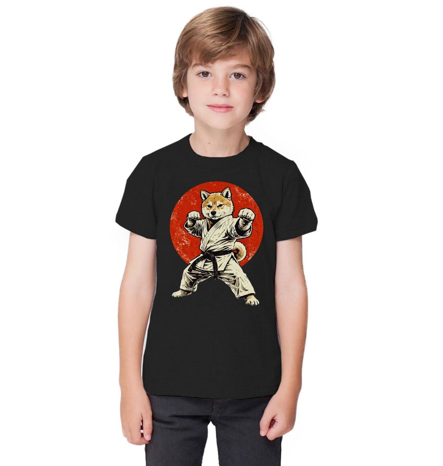 Dětské tričko Bojovník Shiba-Inu. Stylový design zachycuje odhodlaného psa ve stylu bojového umění, inspirovaný japonskou estetikou. Shiba Inu v postoji připraveném k akci působí silně i hravě zároveň, což z tohoto motivu dělá originální a energický design pro milovníky psů i bojových sportů.